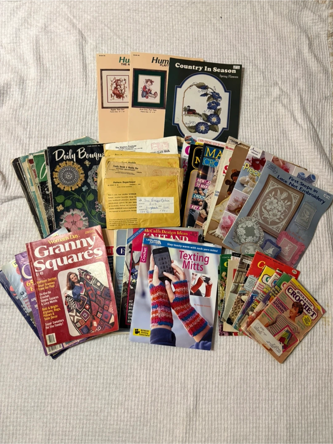 This bundle includes various craft magazines focusing on crochet, knitting, and needlework. Titles include Granny Squares, Texting Mitts, and Country in Season, plus others with quilting and general craft patterns. Great for crafters looking for new projects!