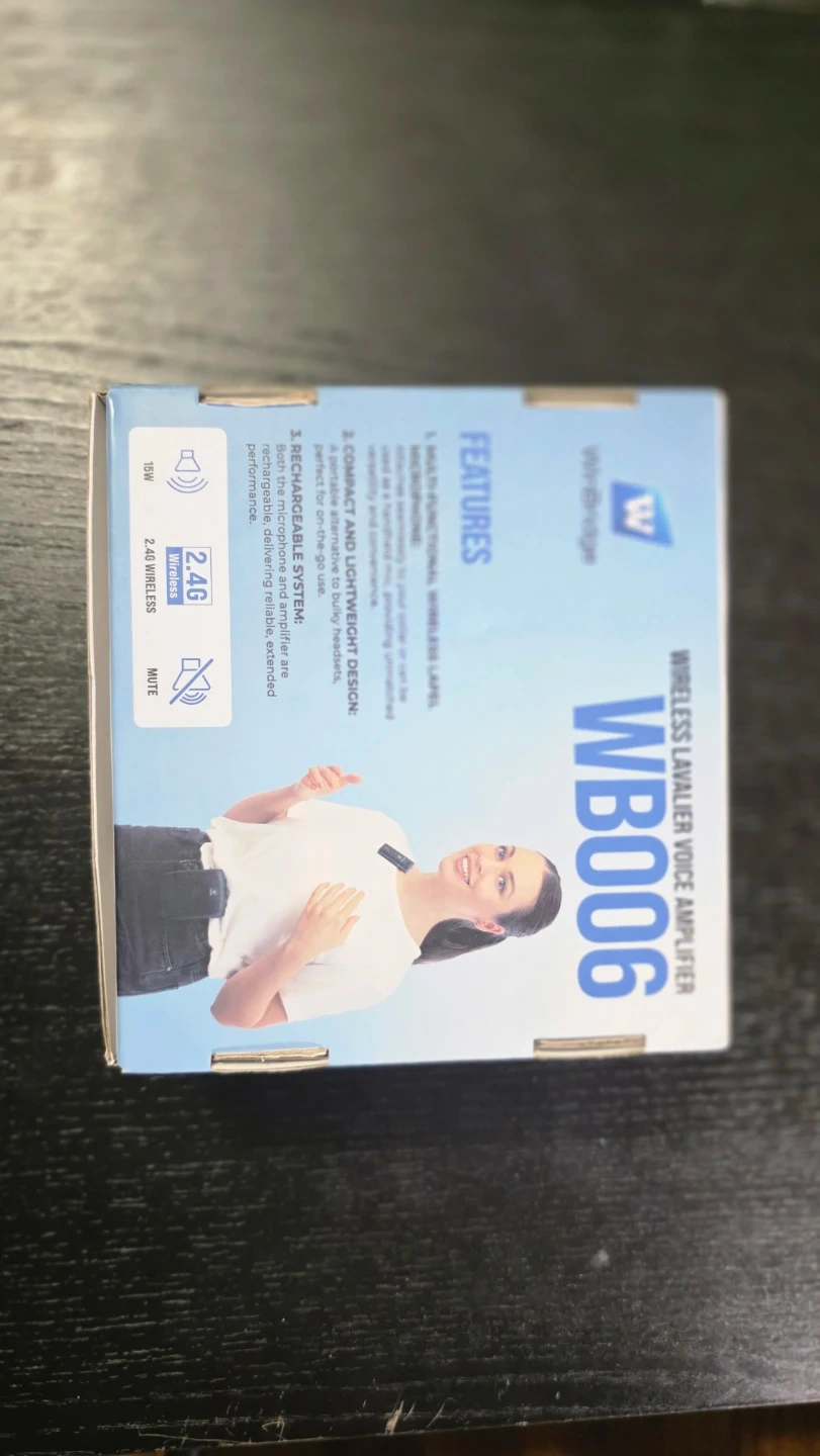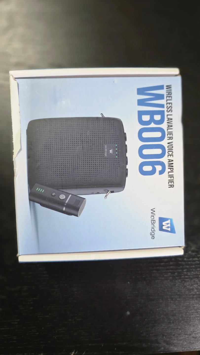This is a WinBridge WB006 wireless lavalier voice amplifier system. It's 2.4G wireless with a rechargeable battery. The amplifier has a 2600mAh battery capacity, offering 12-15 hours of working time.