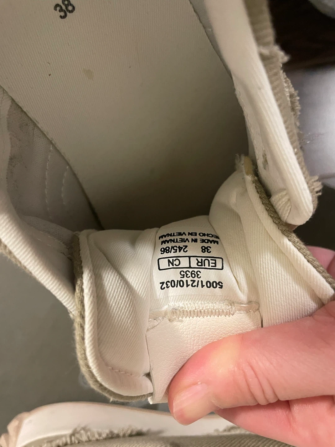 ZARA women's canvas sneakers in a neutral khaki colour. These shoes are a European size 38. They feature a distressed, frayed hem design along the edges. Perfect for casual everyday wear!