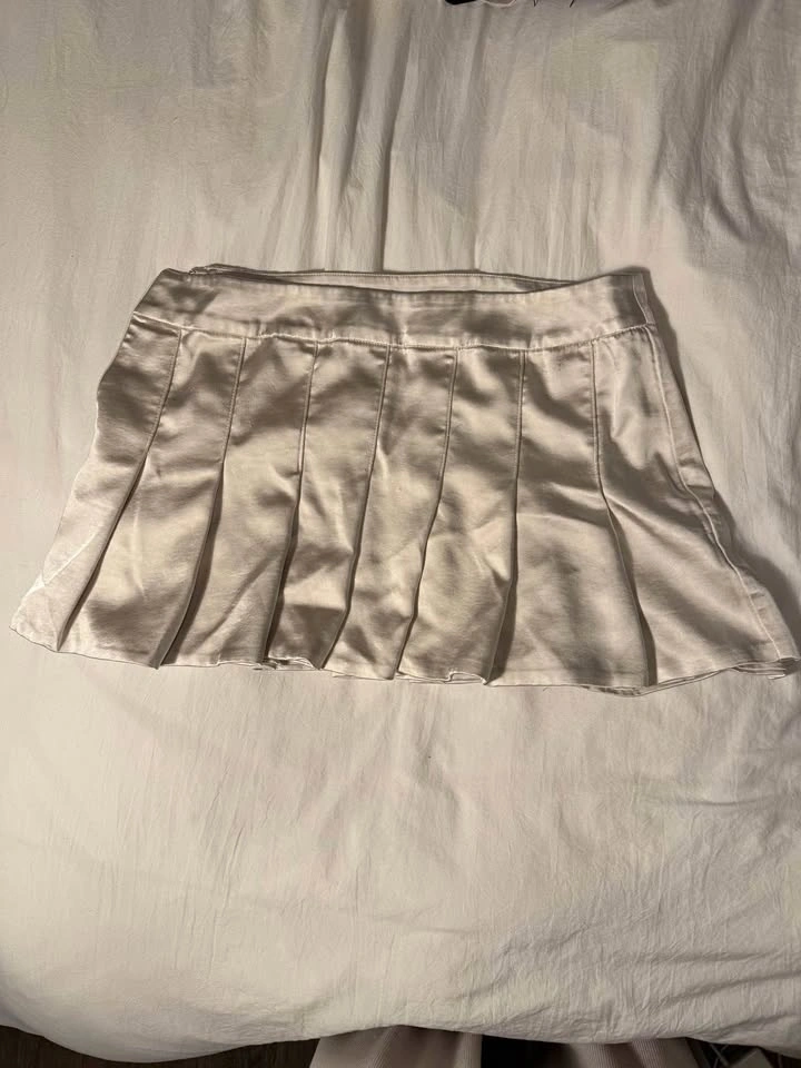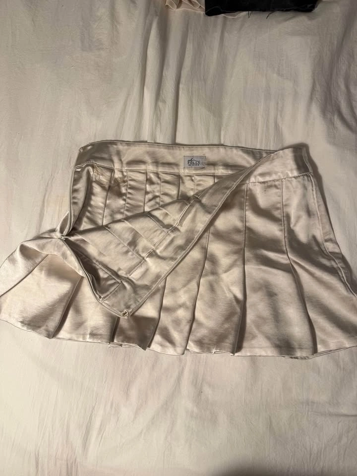 Champagne / ivory-toned satin pleated mini skirt from Oh Polly. High-shine satin finish with structured pleats. Elegant, feminine piece — perfect for nights out, parties, or dressed-down styling with a knit.