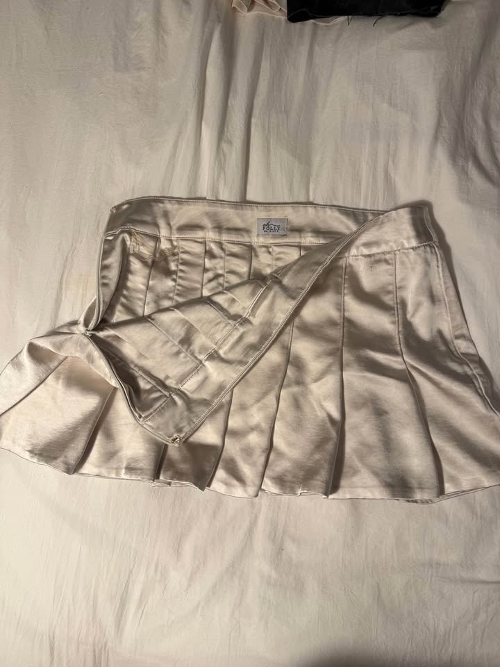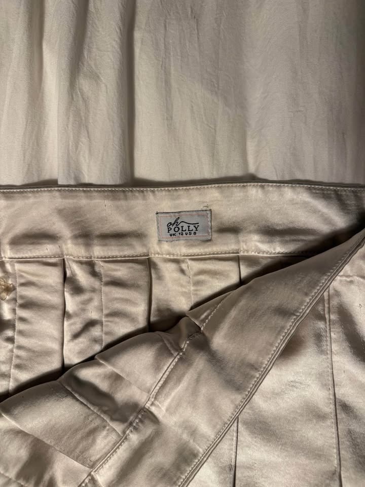 Champagne / ivory-toned satin pleated mini skirt from Oh Polly. High-shine satin finish with structured pleats. Elegant, feminine piece — perfect for nights out, parties, or dressed-down styling with a knit.