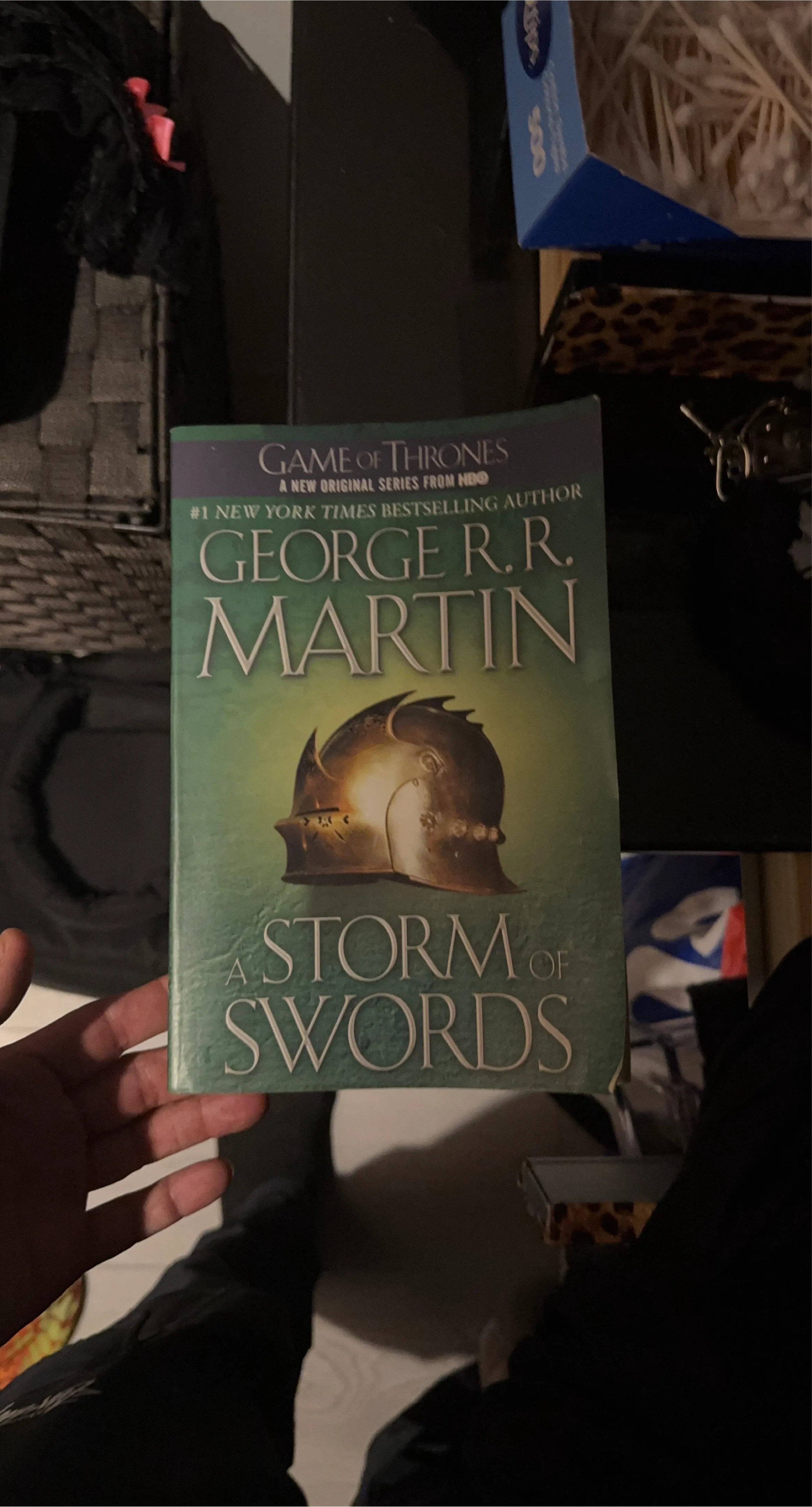 This is 'A Storm of Swords', a book by George R.R. Martin from the Game of Thrones series. It's a #1 New York Times Bestselling Author title. This paperback edition is from the original HBO series.