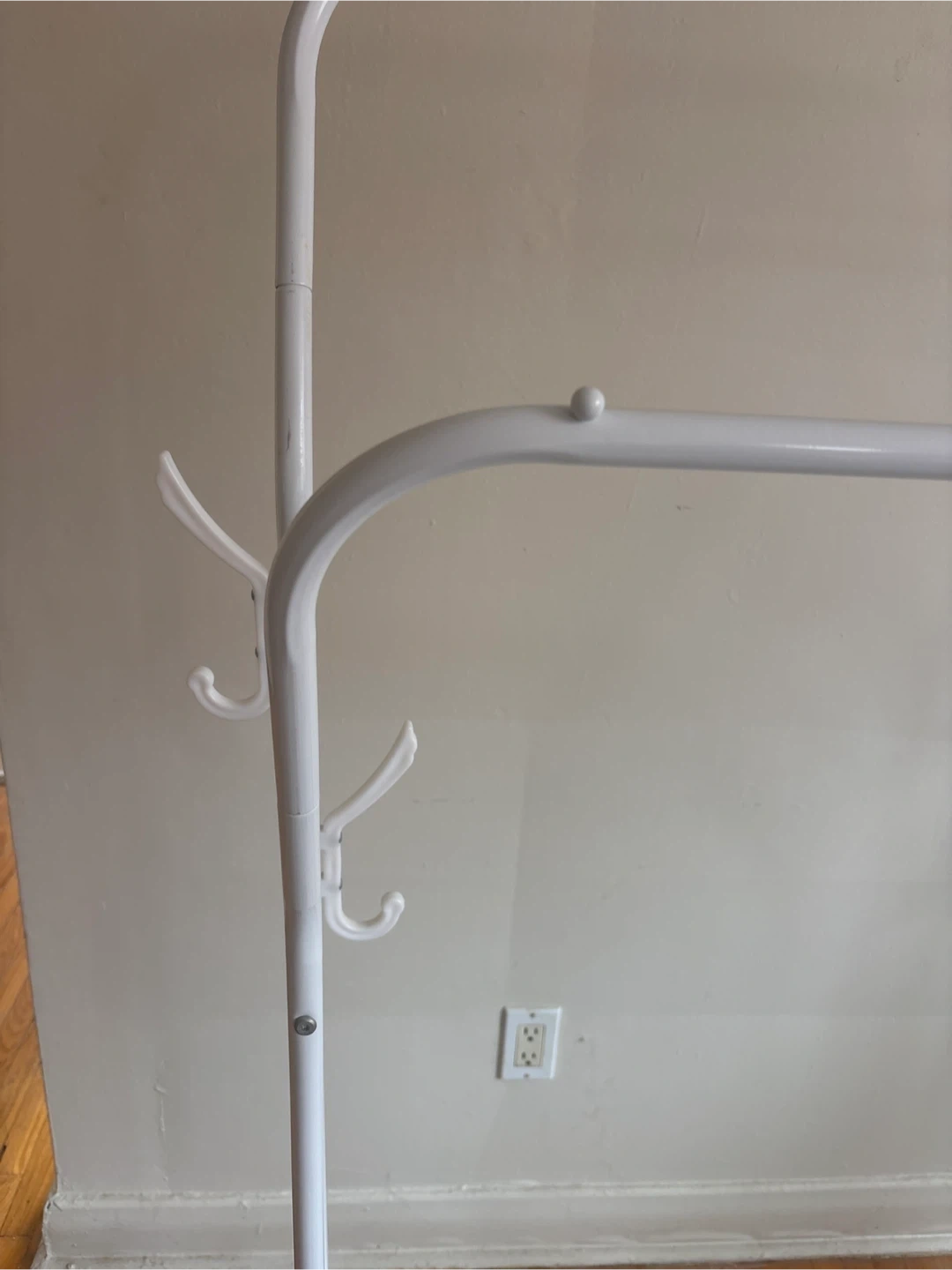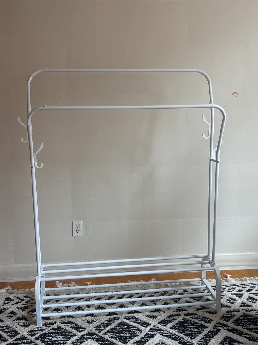 This white metal garment rack features a top bar for hanging clothes and a lower shelf for shoes. It also includes four hooks on the side for extra storage. It's made of sturdy metal and is perfect for organizing your entryway or bedroom.