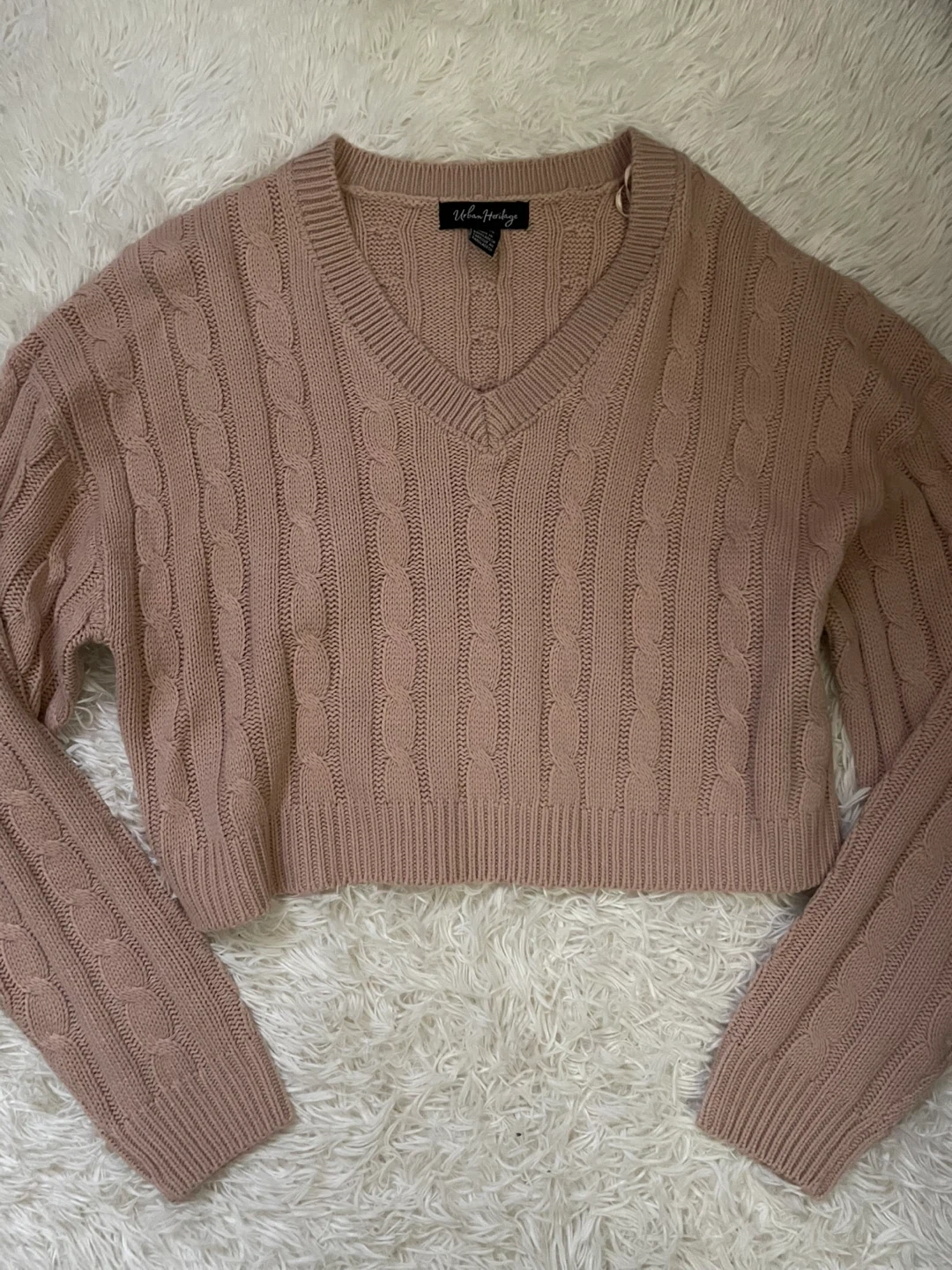 This is an Urban Heritage cropped V-neck sweater. It's a cable knit style in a pretty pink colour. Made in Bangladesh.