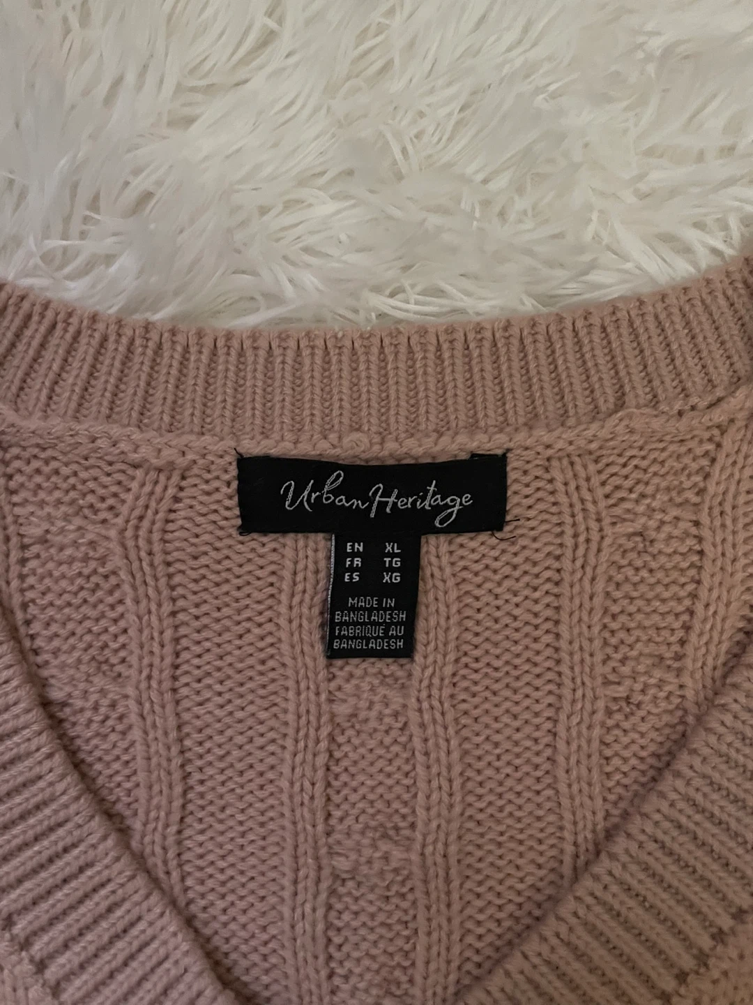 This is an Urban Heritage cropped V-neck sweater. It's a cable knit style in a pretty pink colour. Made in Bangladesh.