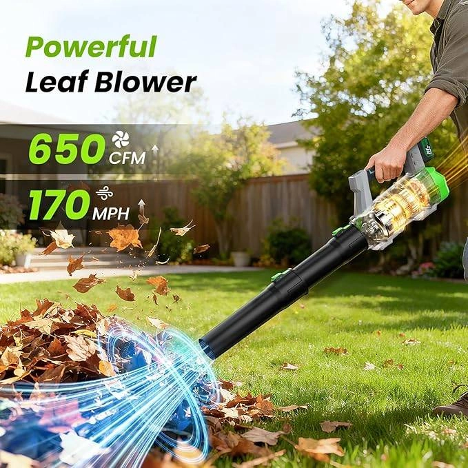 Description: Leaf Blower Cordless, 650CFM/170MPH Electric Leaf Blower with 4000mAh Battery and Charger, PATOOLIO 5 Speed Mode Powerful Cordless Leaf Blower Handheld for Lawn Care, Leaves Blowing,Snow Blowing
