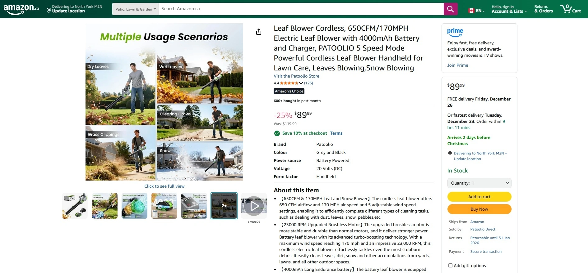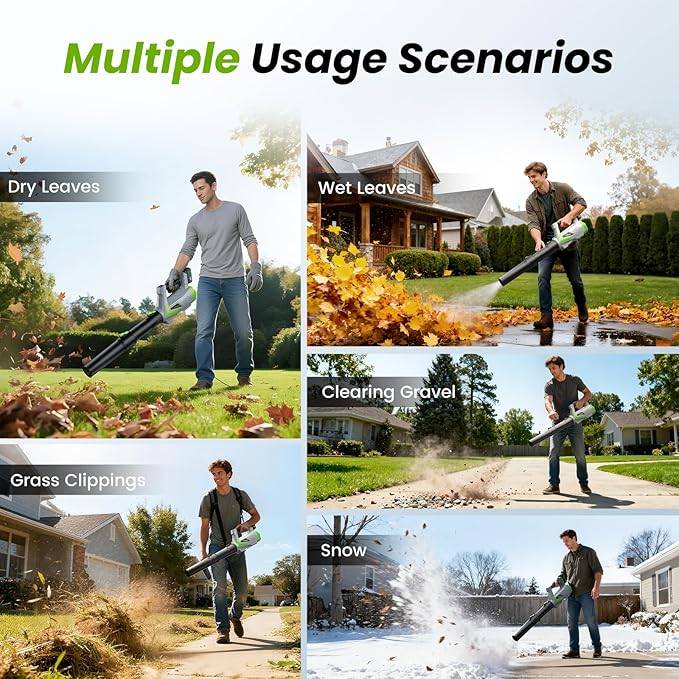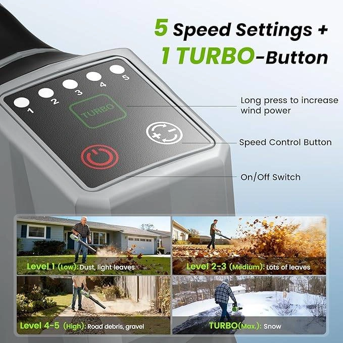 Description: Leaf Blower Cordless, 650CFM/170MPH Electric Leaf Blower with 4000mAh Battery and Charger, PATOOLIO 5 Speed Mode Powerful Cordless Leaf Blower Handheld for Lawn Care, Leaves Blowing,Snow Blowing