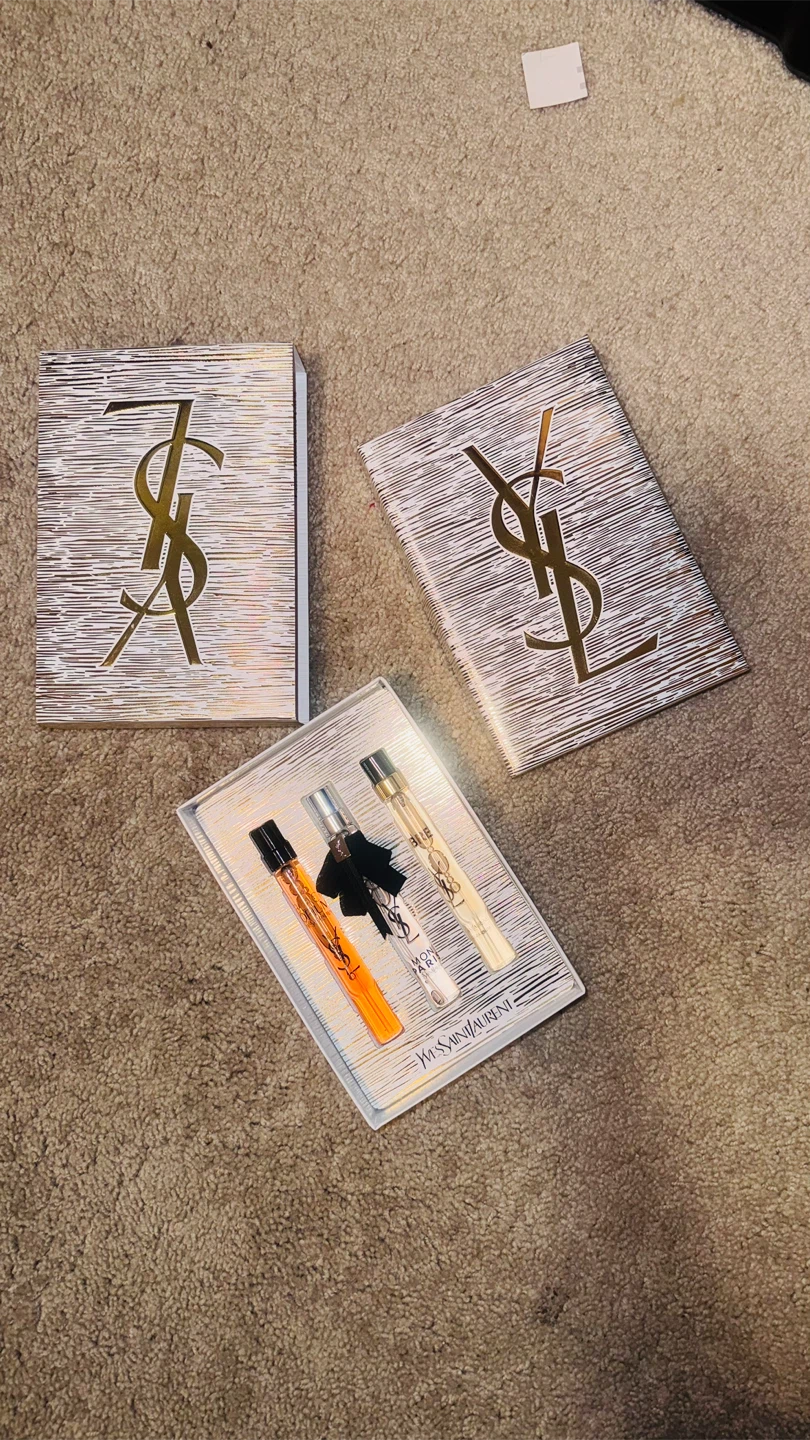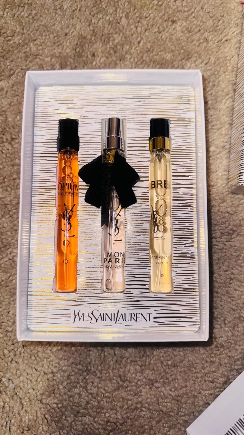 Here's a cute Yves Saint Laurent miniature perfume set! It includes three different scents: Black Opium, Mon Paris, and Libre. The set comes with the original box.