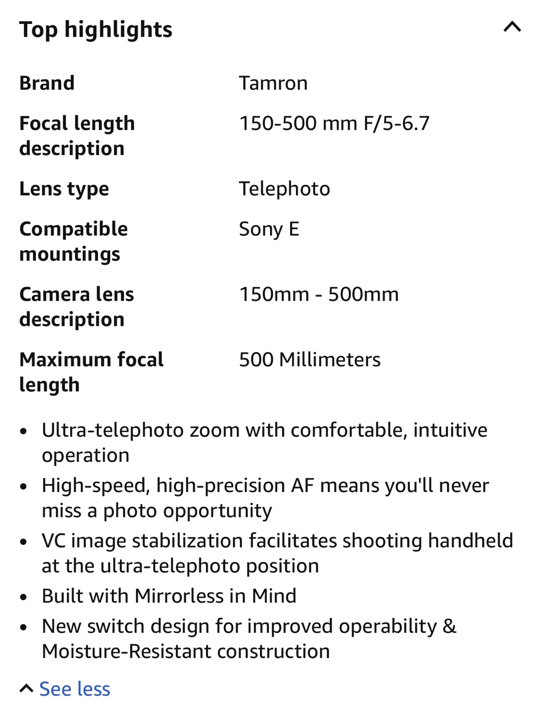 Tamron A057 150-500mm F/5-6.7 Lens for Sony E-Mount