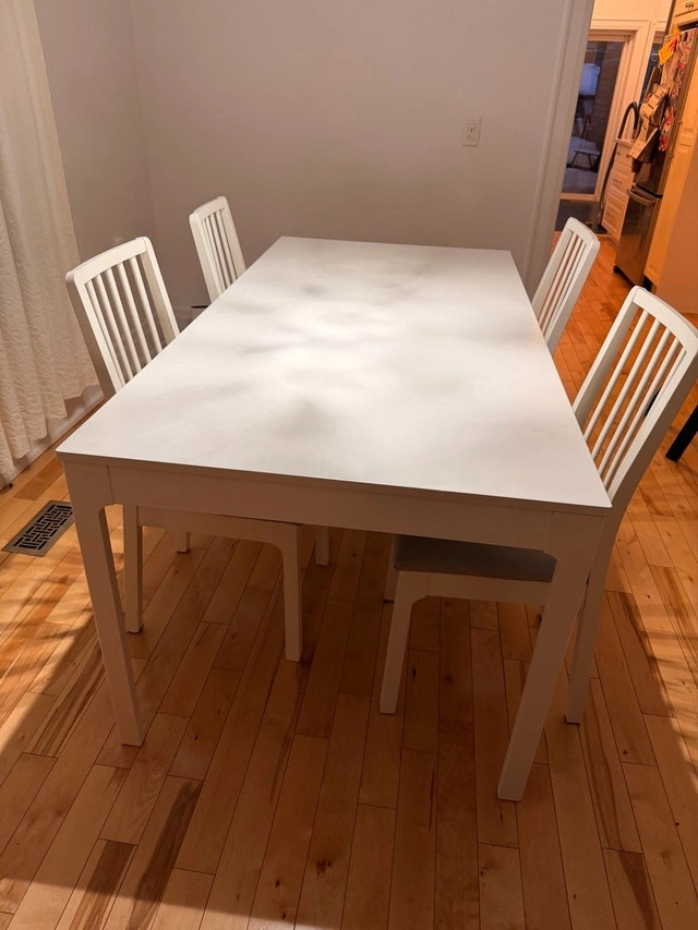 This extendable IKEA Ekedalen table paired with 4 chairs is perfect for any dining space, offering both style and functionality. The set is in used condition, but has been well maintained and has lots of life left. It is only one year old. Table: IKEA Ekedalen, white, extendable. Chairs: 4 IKEA white chairs with Tibbleby beige-gray seat covers. Only pick up.
