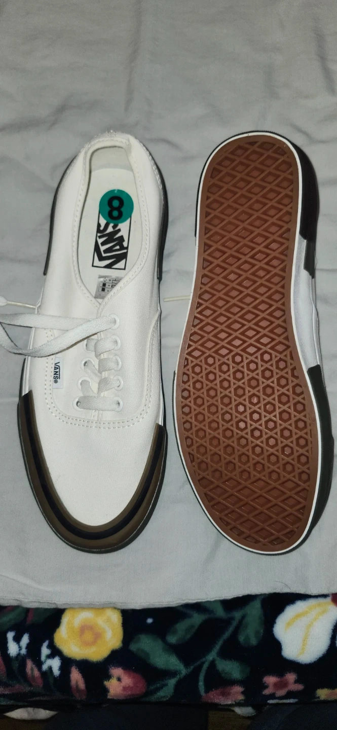 These are white Vans Authentic shoes with a size 8 tag visible. They feature a classic Vans waffle sole and rubber toe cap. Great for everyday wear!