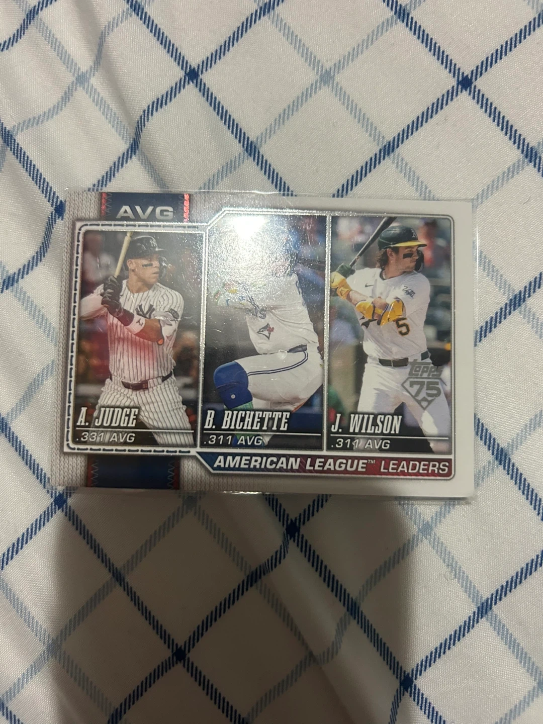 Features American League leaders in AVG with A. Judge, B. Bichette, and J. Wilson. Includes stats for each player. Great card for baseball card collectors!