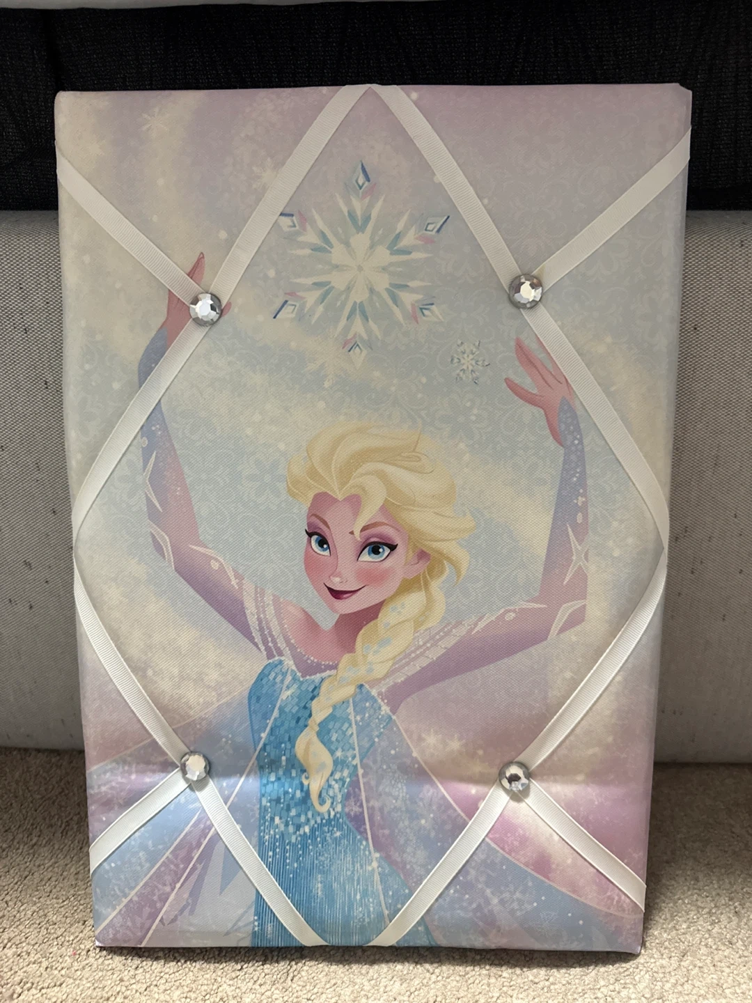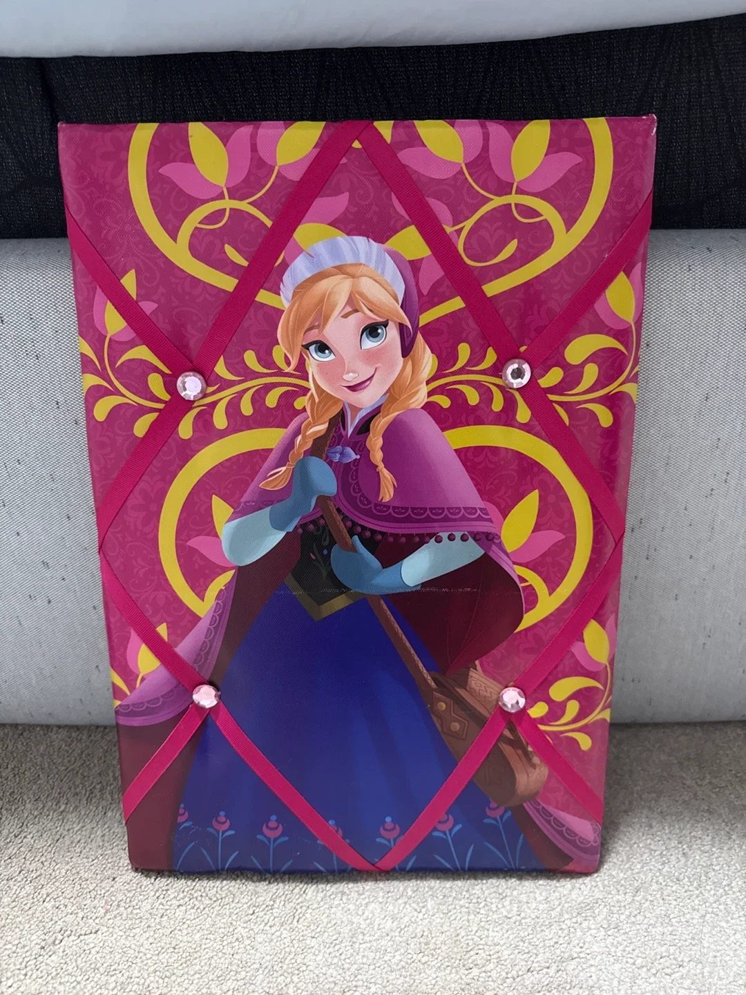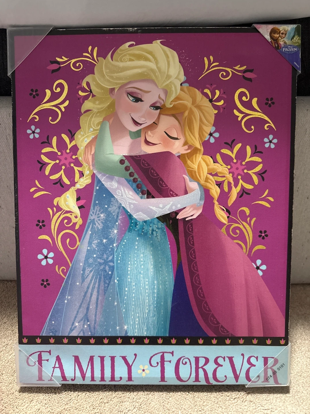Set of four Disney Frozen themed decorative wall art pieces. Features Elsa and Anna characters. "Family Forever" text on one piece. Includes ribbon and gem accents on some pieces.each $15 all $50