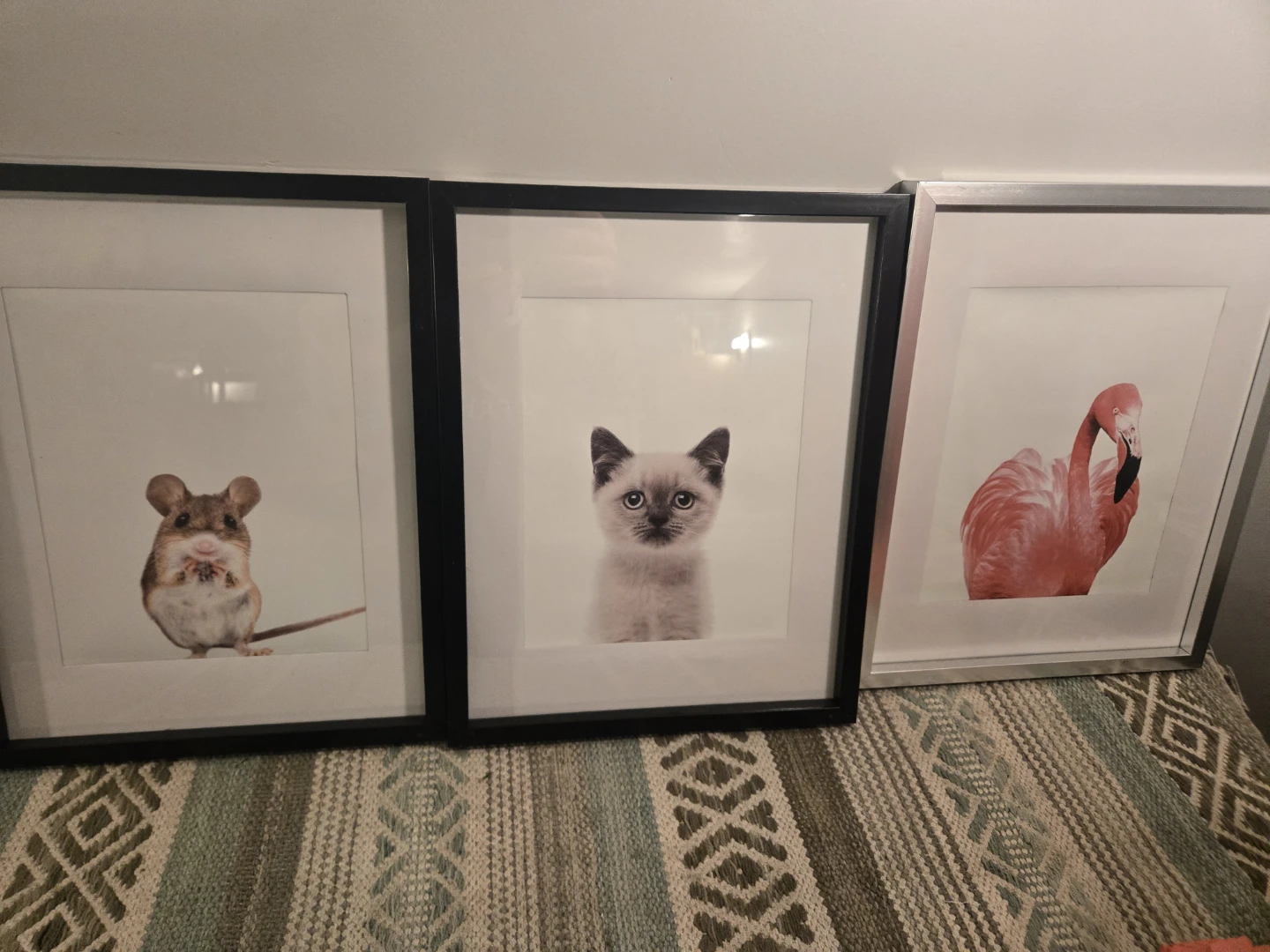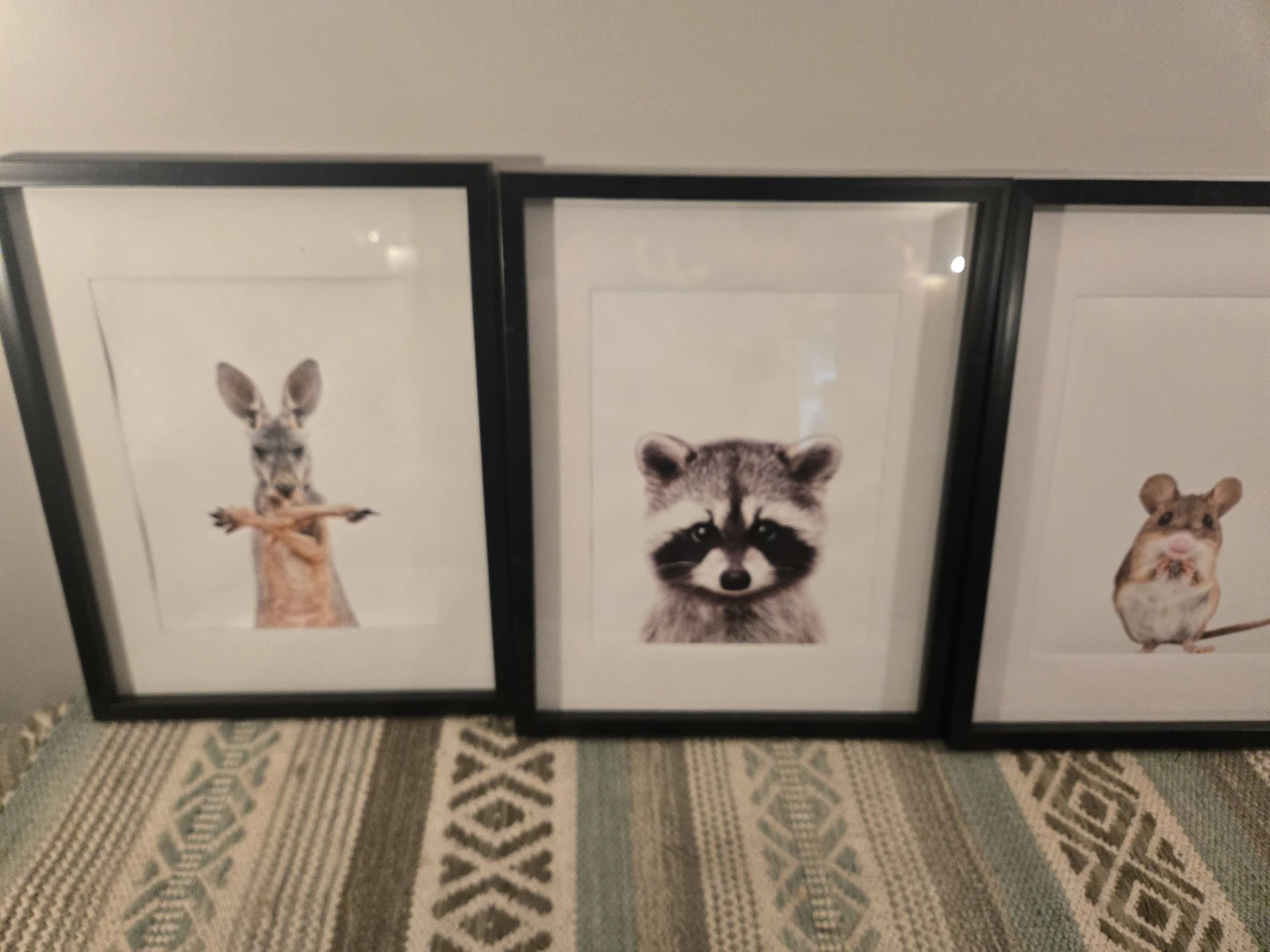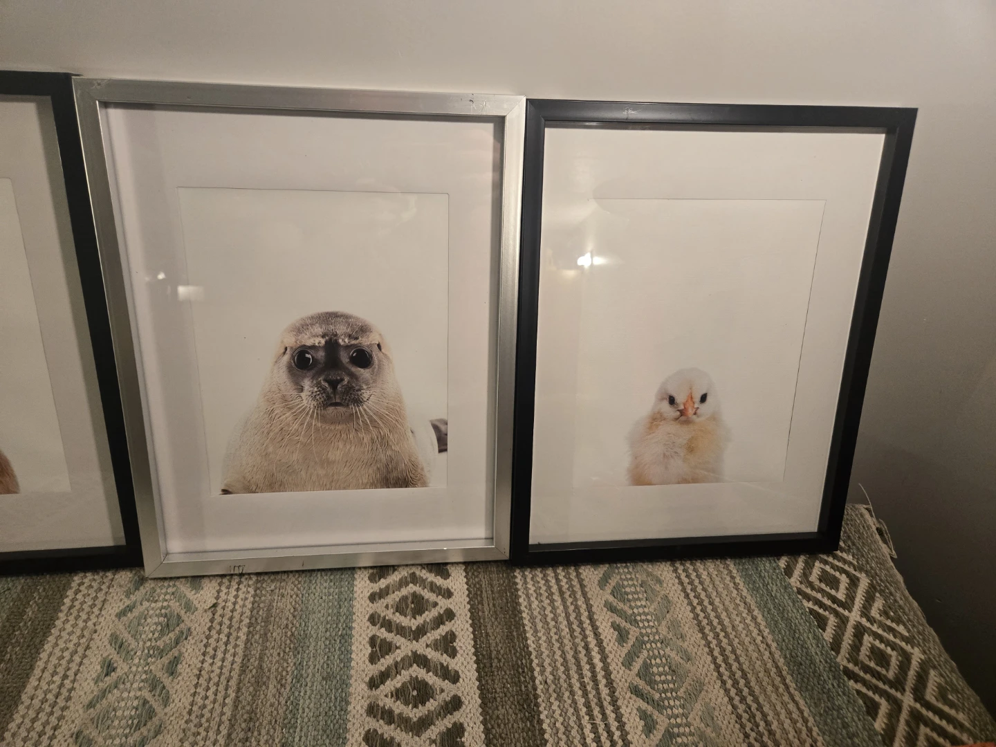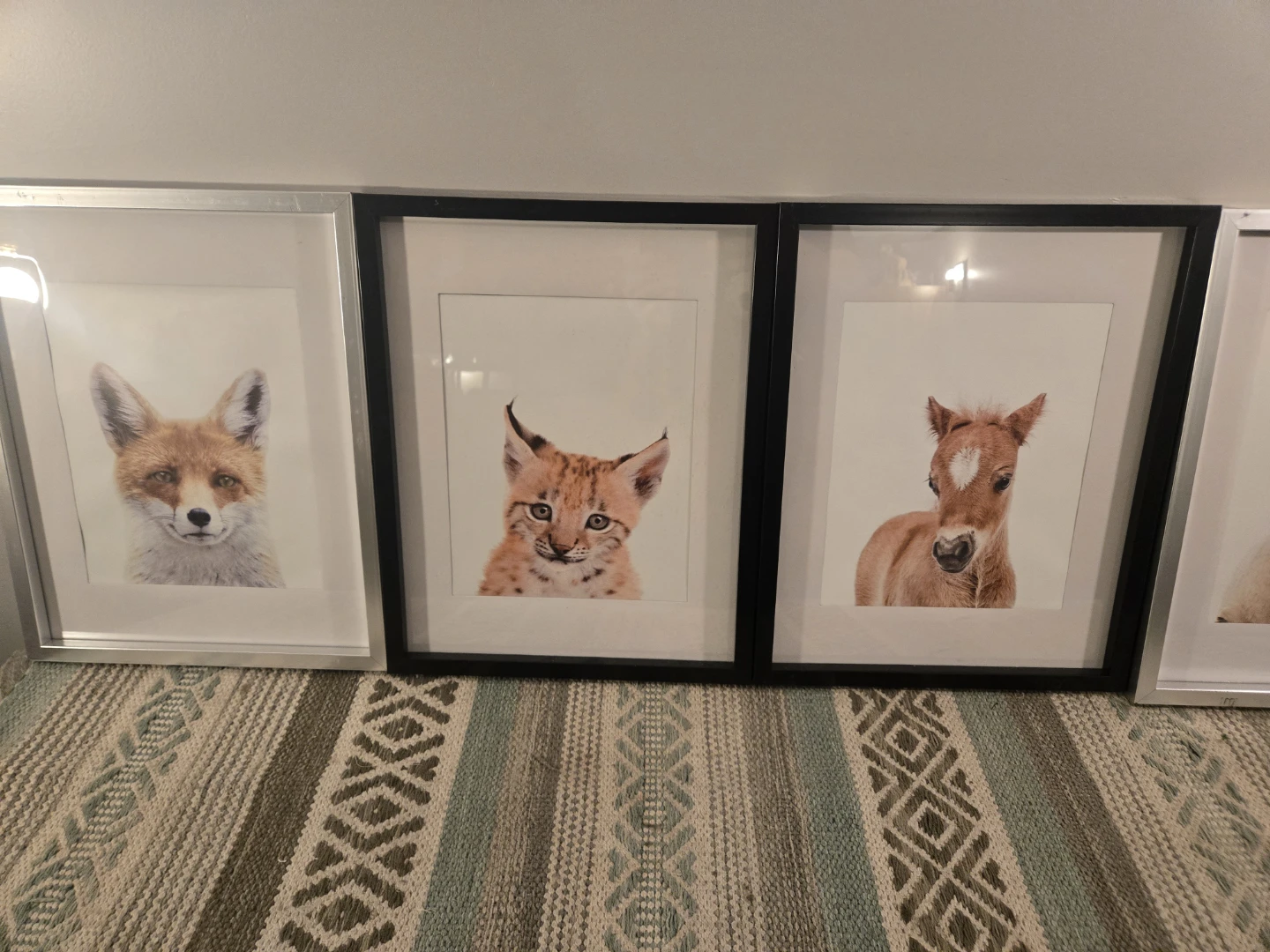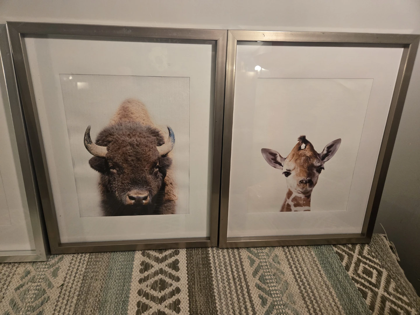 Selling a set of framed animal prints, featuring a lion cub, a hippo, and an ostrich and many more. They would be a cute addition to a nursery or kids' room! We have these framed one and also just prints.