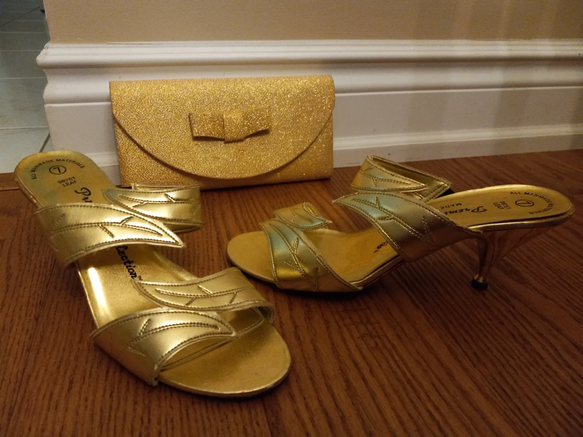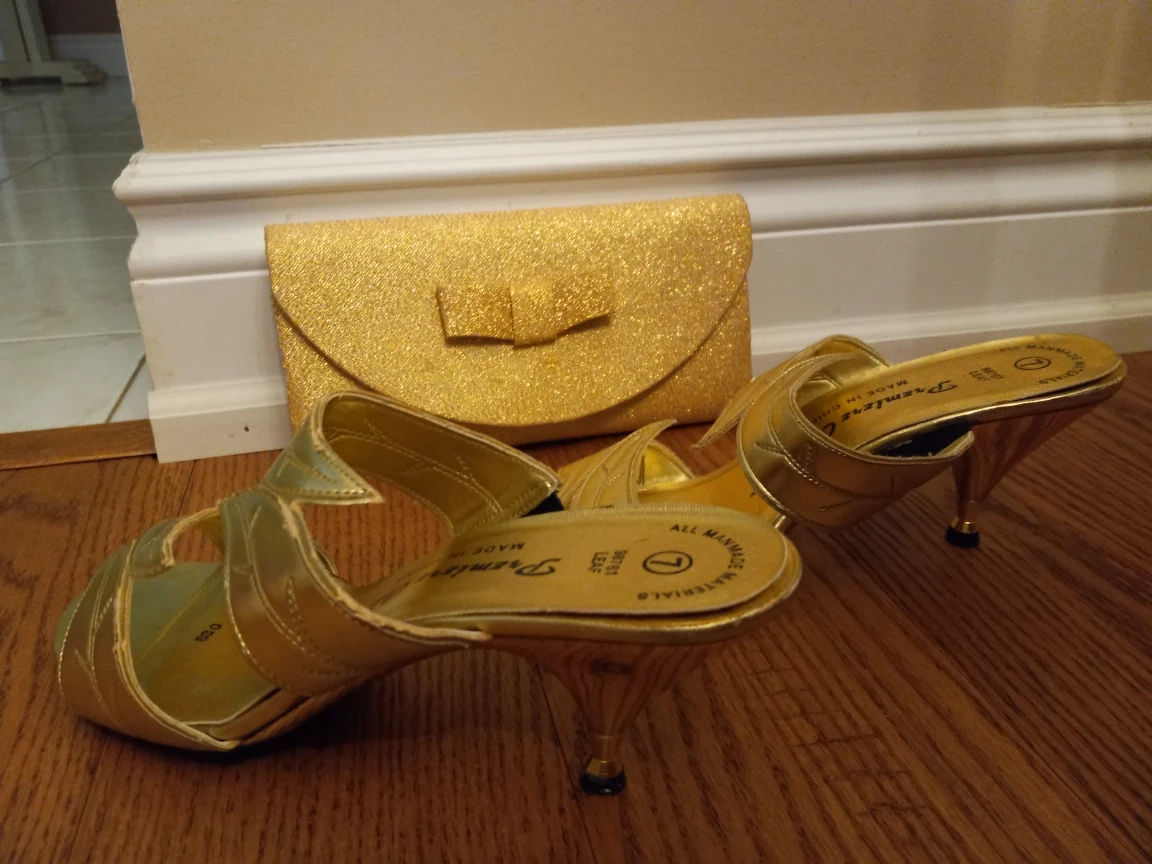 Brand new gold sandals size 7 and clutch purse. Heels 2-1/2 inches high. Ideal for wedding or special occasions. Ideal also as giftgiving for Christmas, Mother'sday or birthday. Pick up at Ellesmere and Brimley.