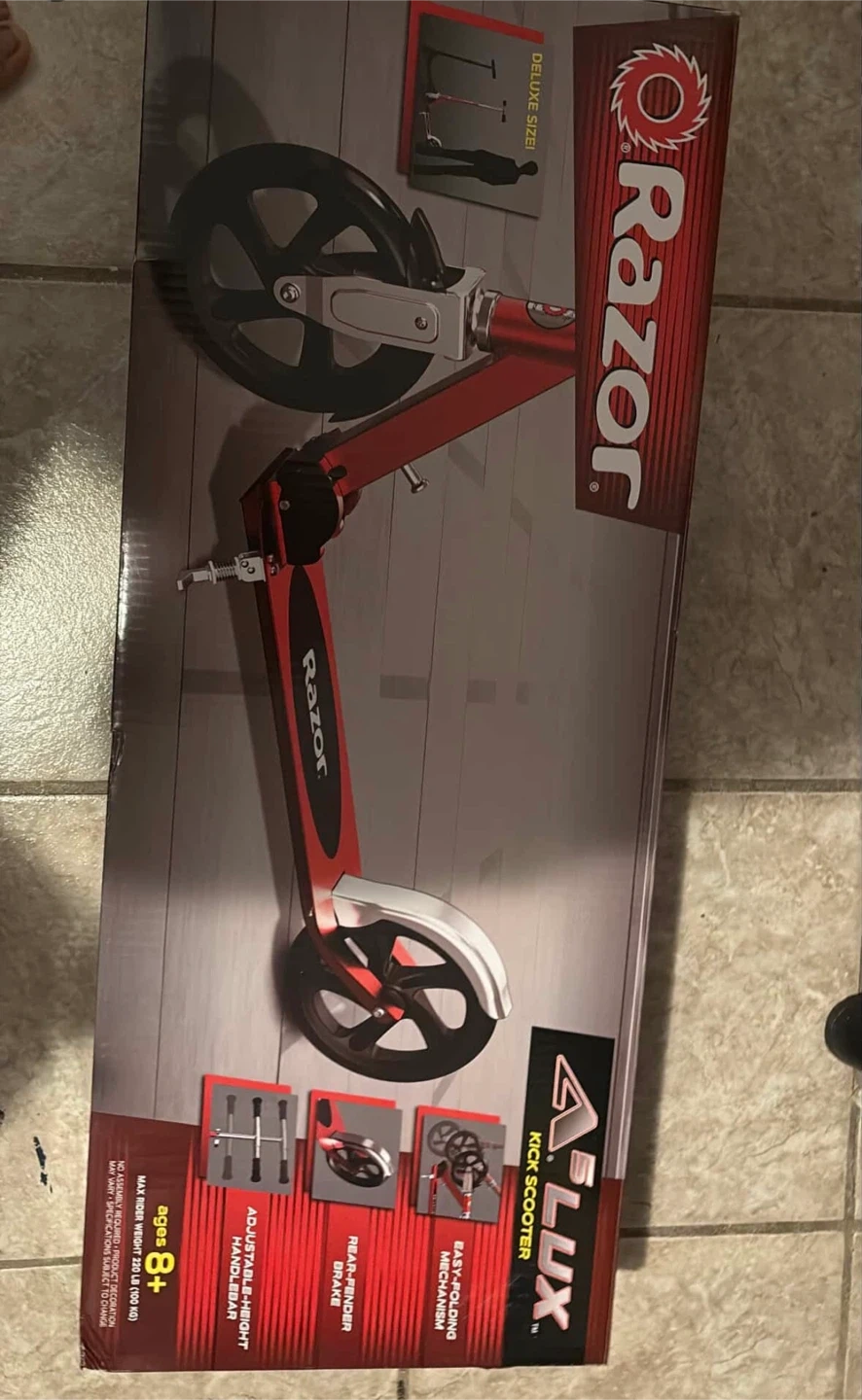 Selling a Razor A Lux Kick Scooter in red! It is suitable for ages 8 and up. It features an adjustable handlebar,and an easy-folding mechanism. The box is included! Still new asking 120 dollars on it.