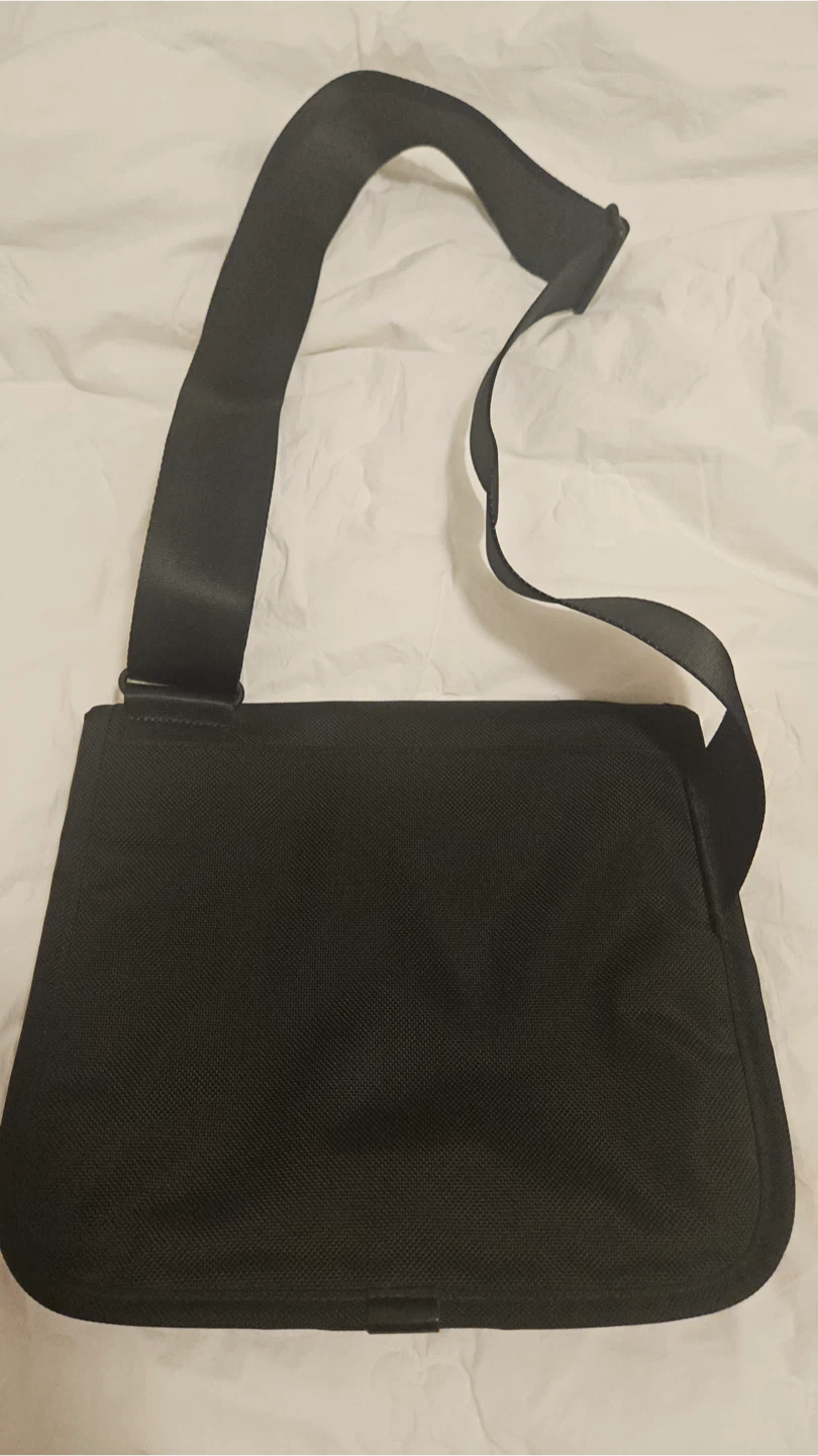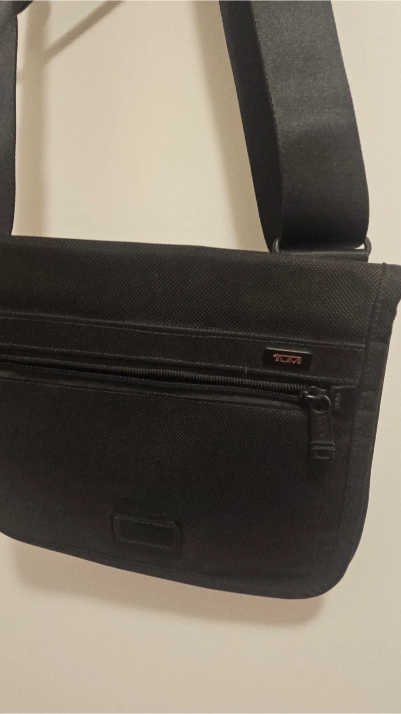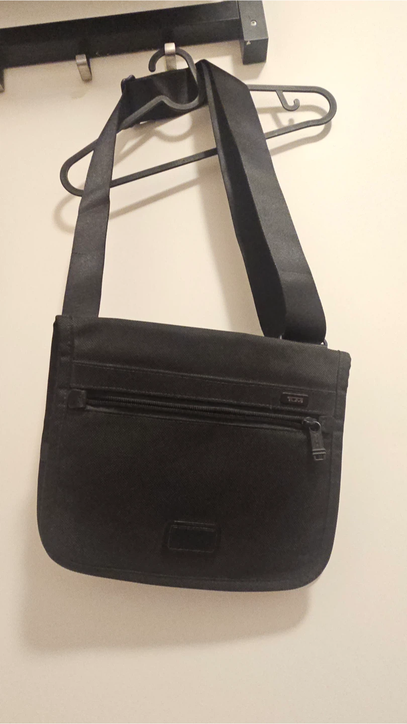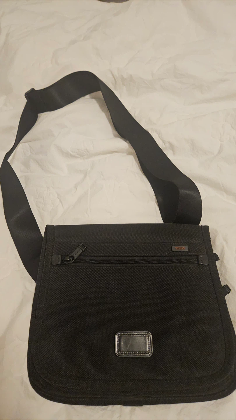 A TUMI black messenger bag with an adjustable strap. It features a zippered front pocket and a main compartment. Durable fabric construction.
