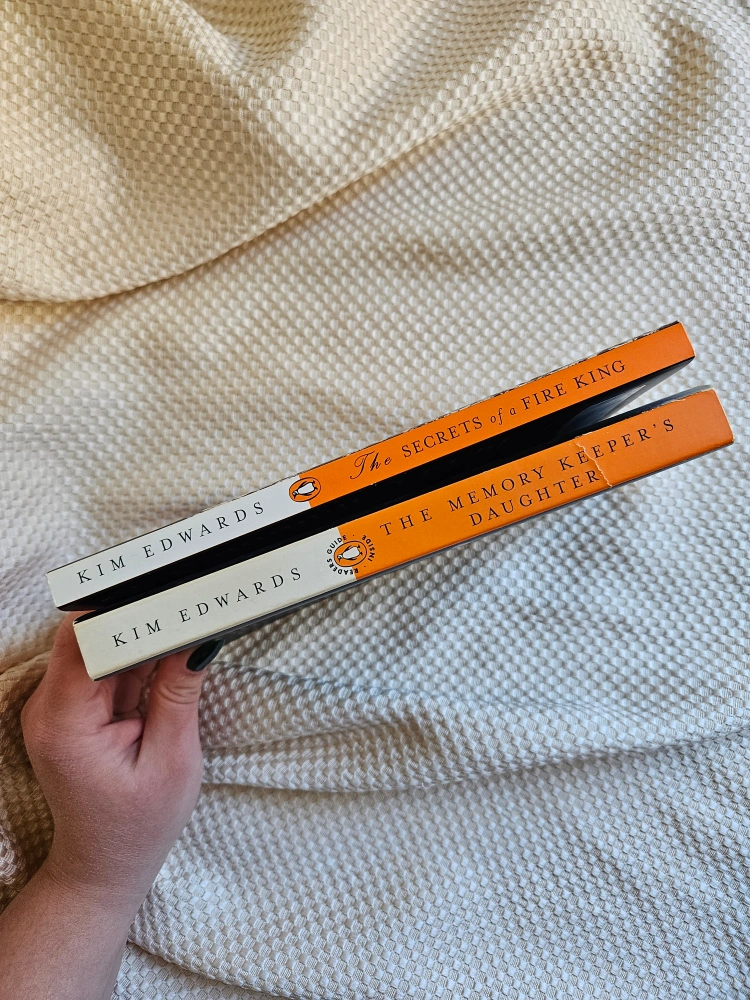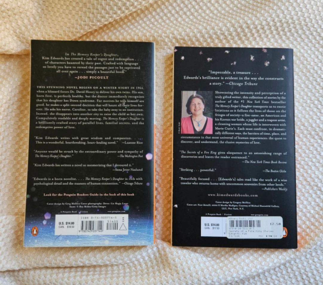 Two novels by Kim Edwards. The Memory Keeper's Daughter, a novel. The Secrets of a Fire King, a collection of stories. Paperback books, have signs of wear.