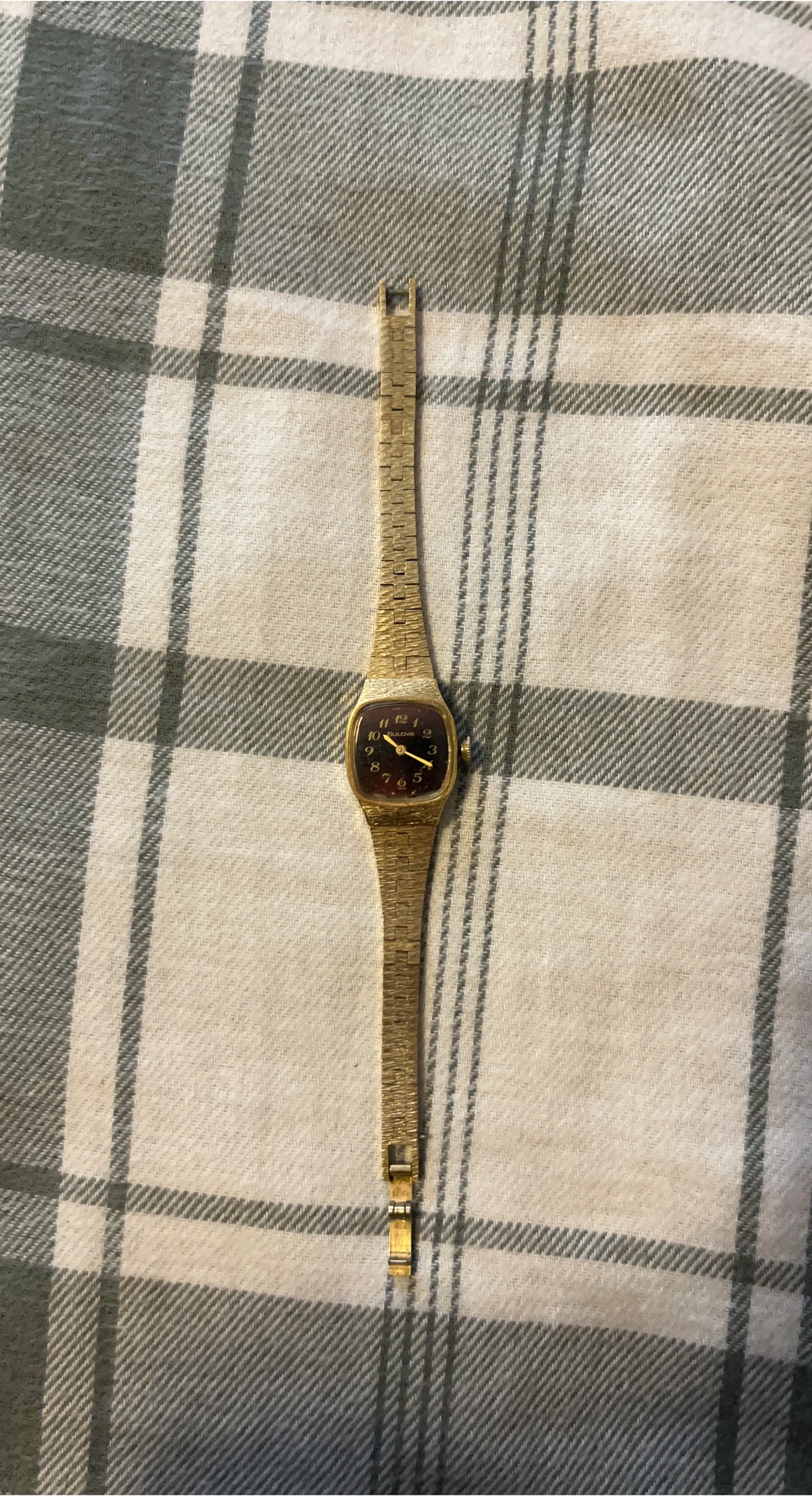Selling a lovely gold-tone Bulova women's watch. It has a dark face and a delicate band. Perfect for adding a touch of elegance to any outfit! Needs a new battery to work.