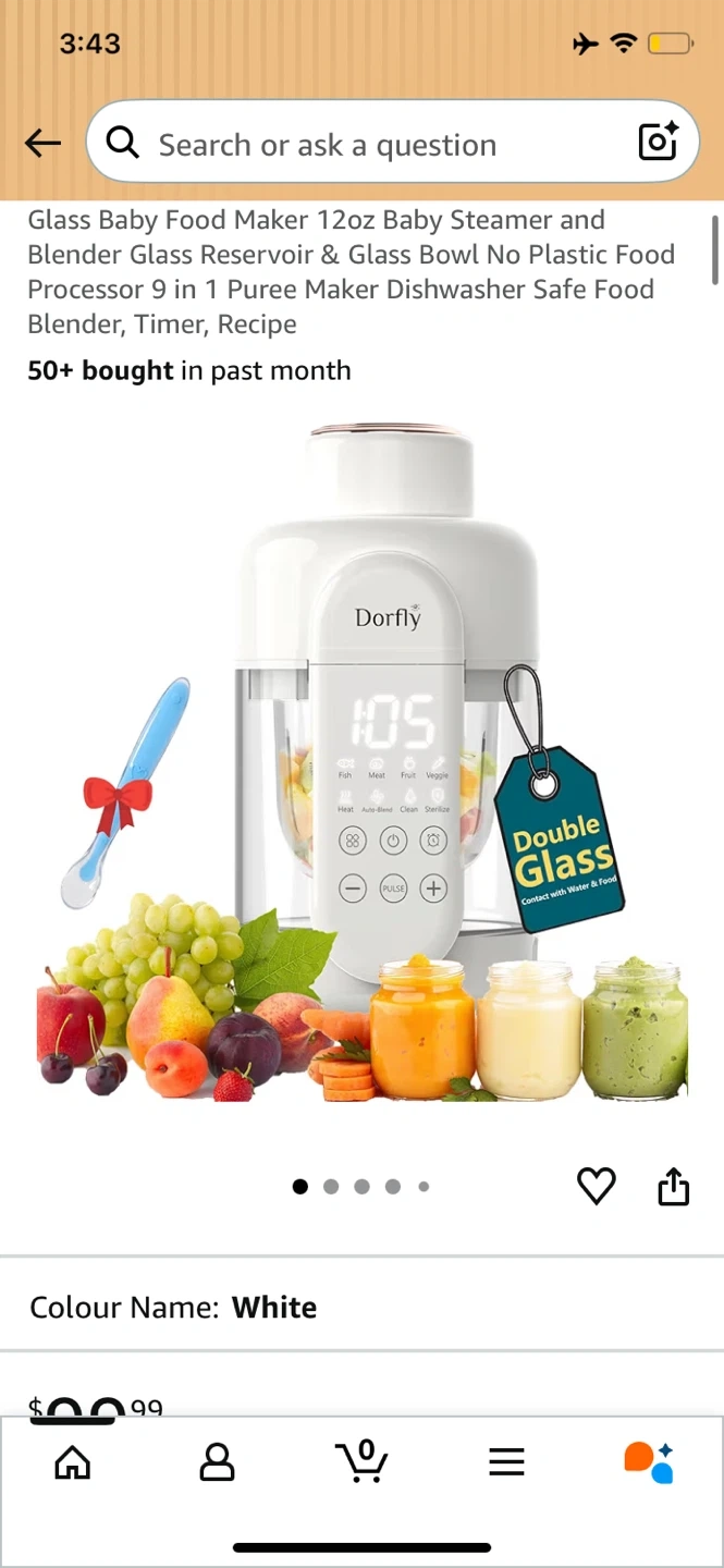 Dorfly glass baby food maker with a 12oz capacity. It's a steamer and blender with a glass reservoir and bowl. Dishwasher safe and includes a timer and recipes.