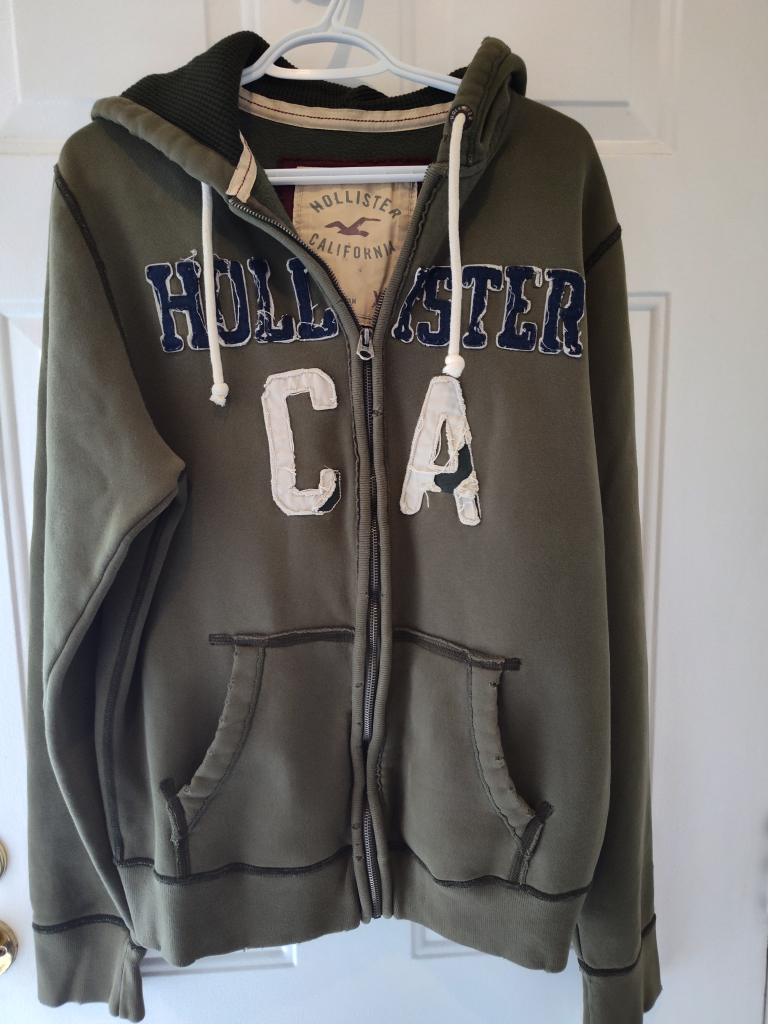 Selling a Hollister California zip-up hoodie in olive green! It's in excellent condition and is a size XL. Perfect for layering or wearing on its only. Cash only p/u Streetsville