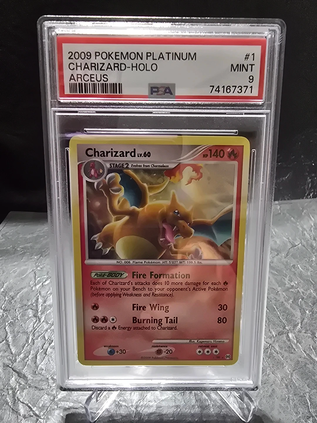 Pokemon trading card graded by PSA - MINT 9. It's a 2009 Pokemon Platinum Arceus #1 Holo Charizard.
