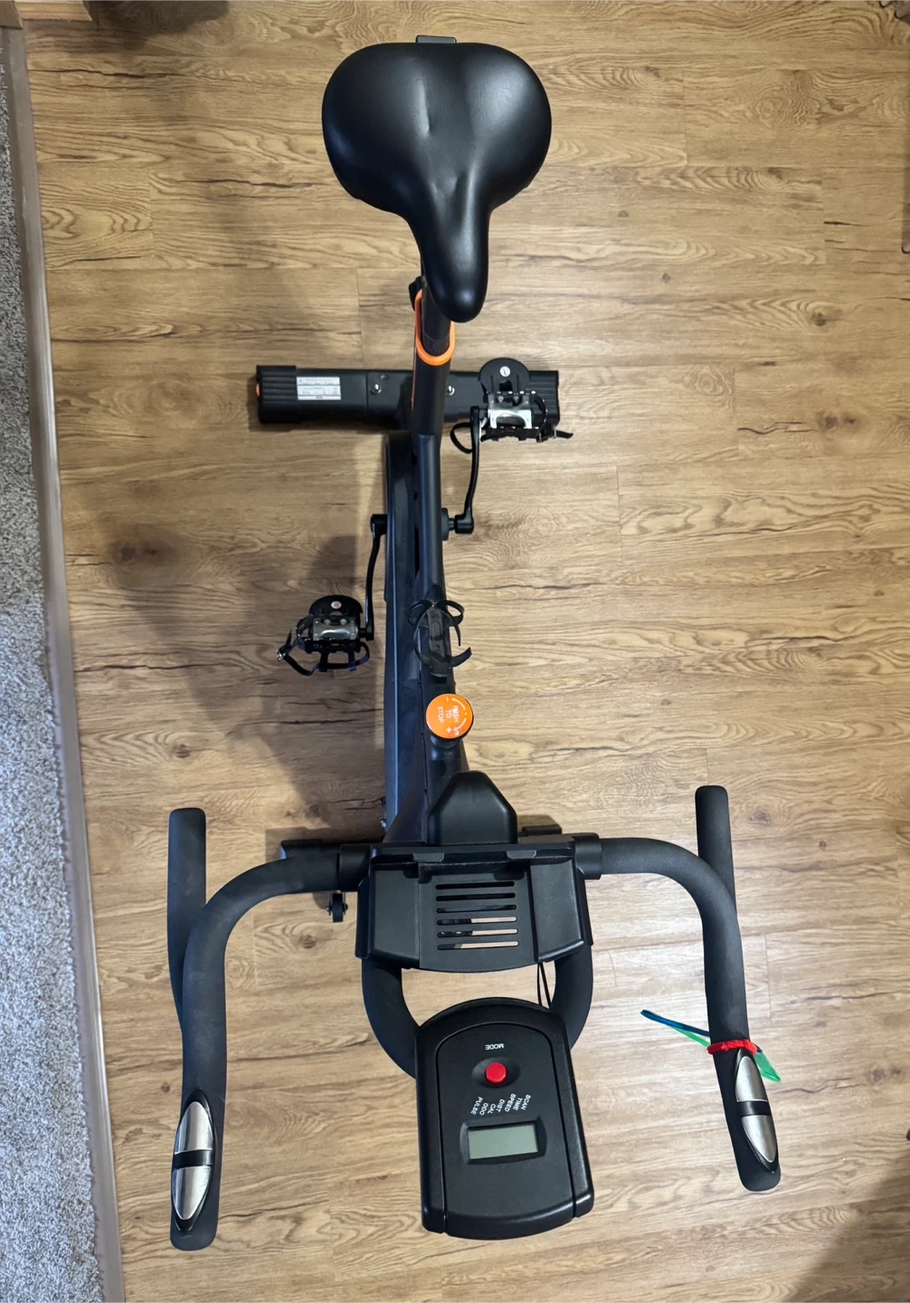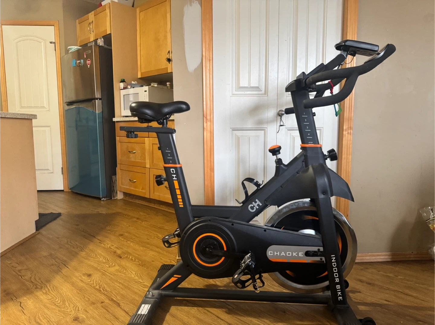Chadke indoor spin bike for home workouts. It's black with orange accents. This bike is great for cardio training at home! Not much used and only pick up available.