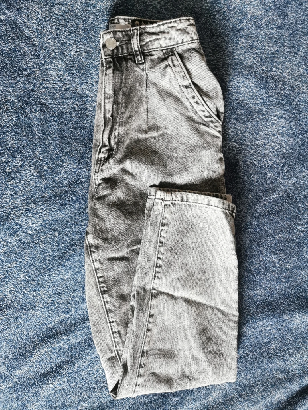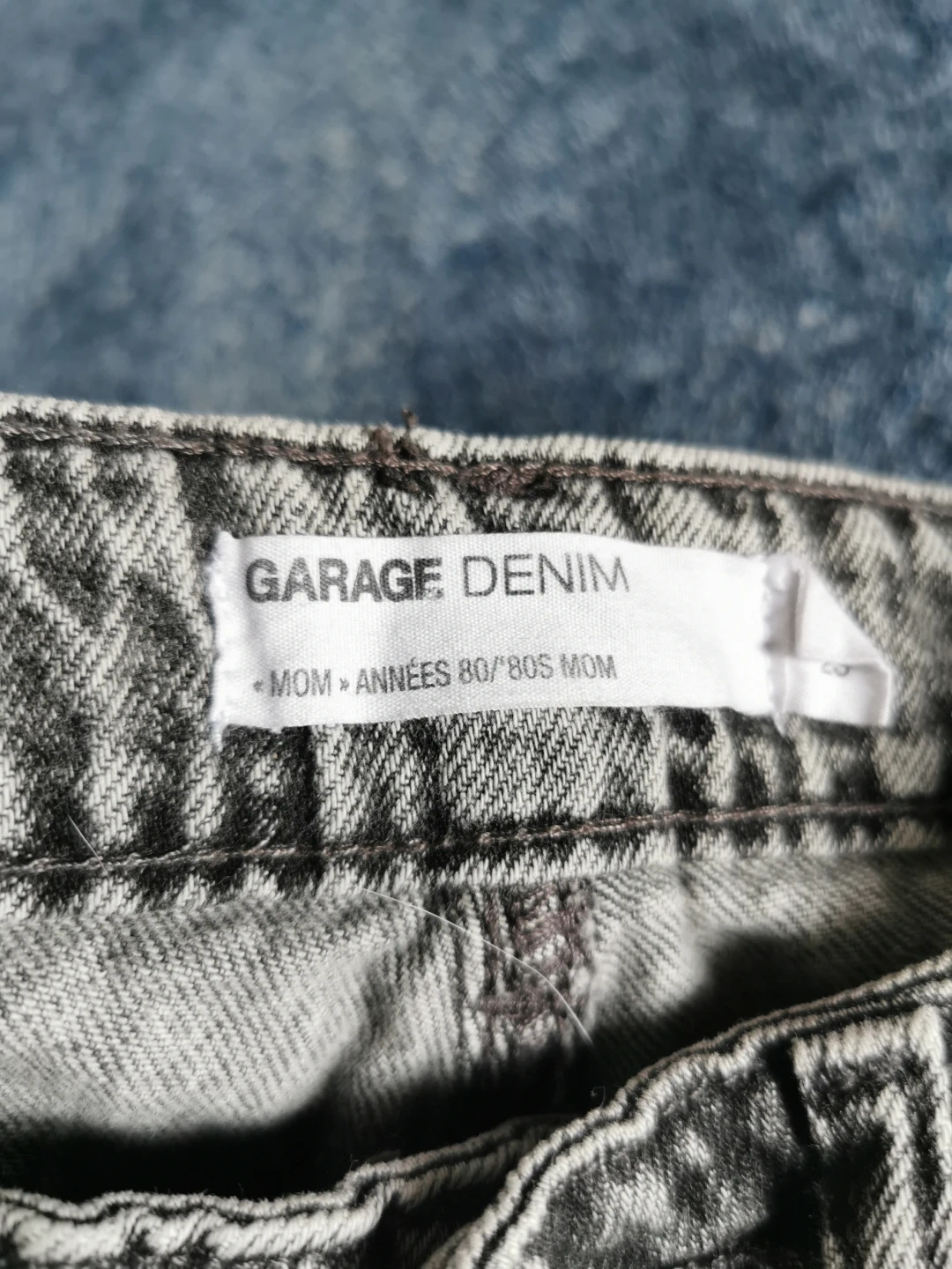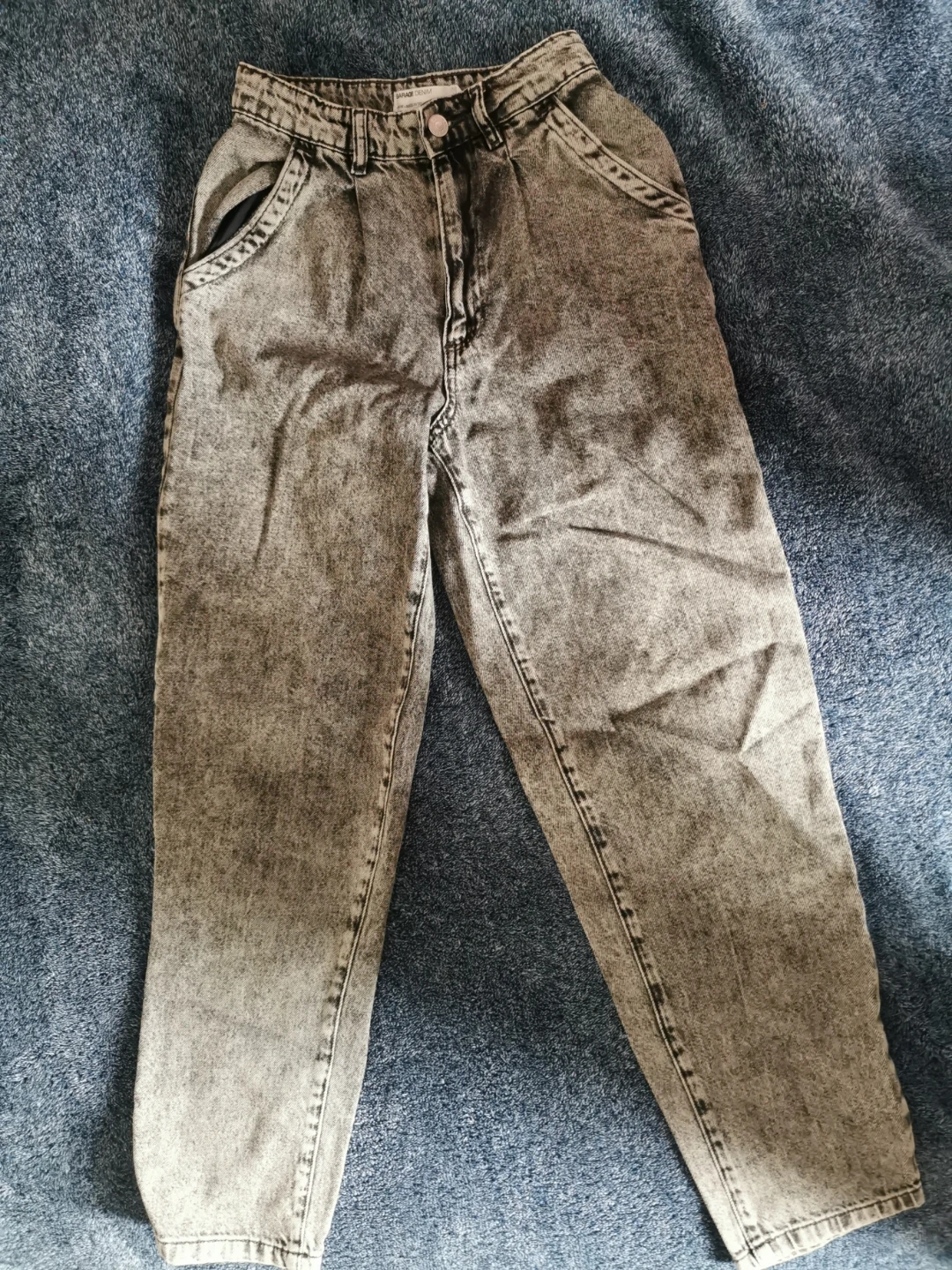 GARAGE DENIM Mom jeans in a grey acid wash. Made with 100% combed cotton. These jeans are a size 00. A classic style for everyday wear!
