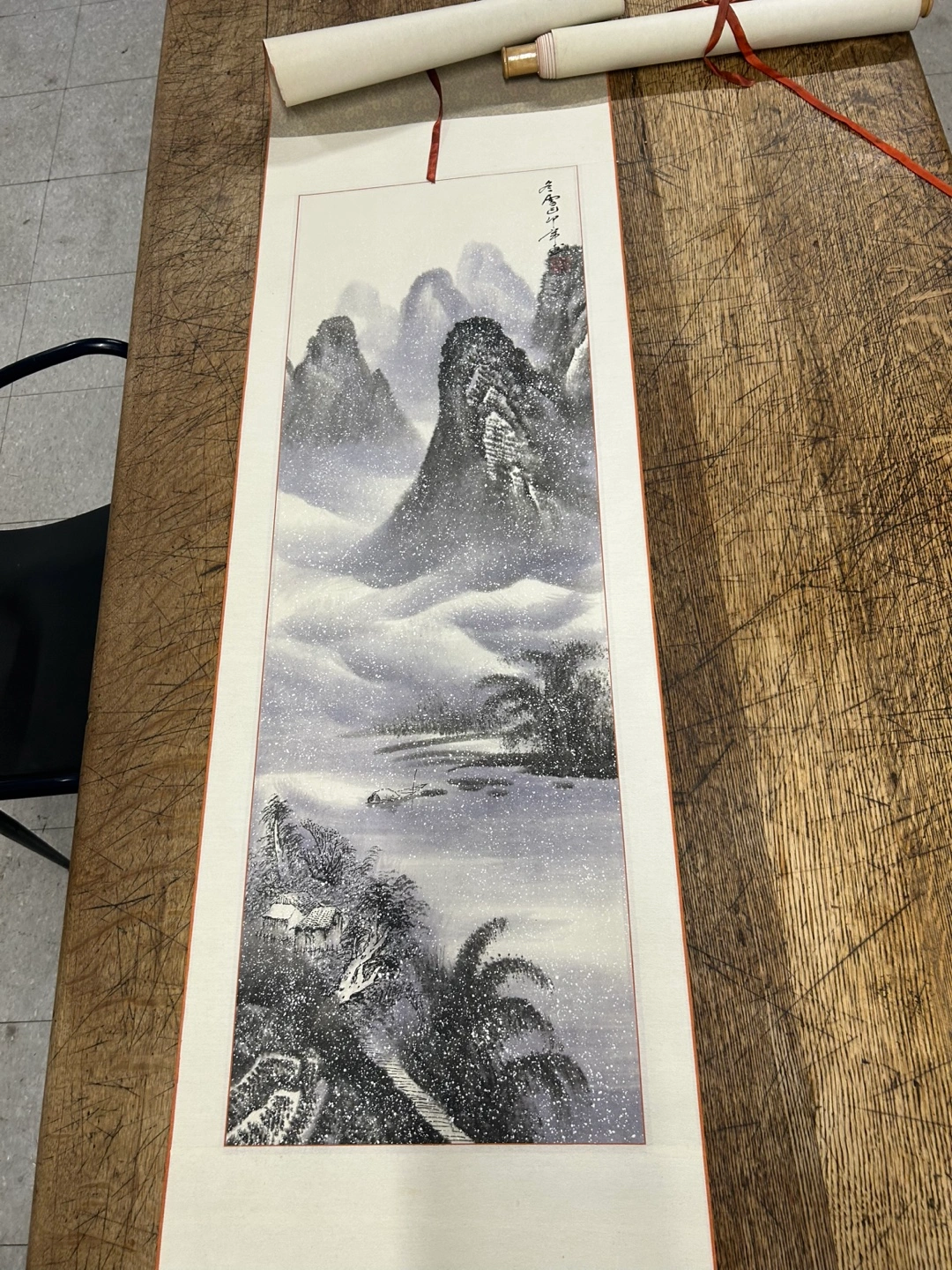 Selling a vintage Chinese landscape scroll painting. It features a serene mountain scene with traditional Chinese architecture. The painting is mounted on a scroll, ready to hang and add a touch of elegance to your home