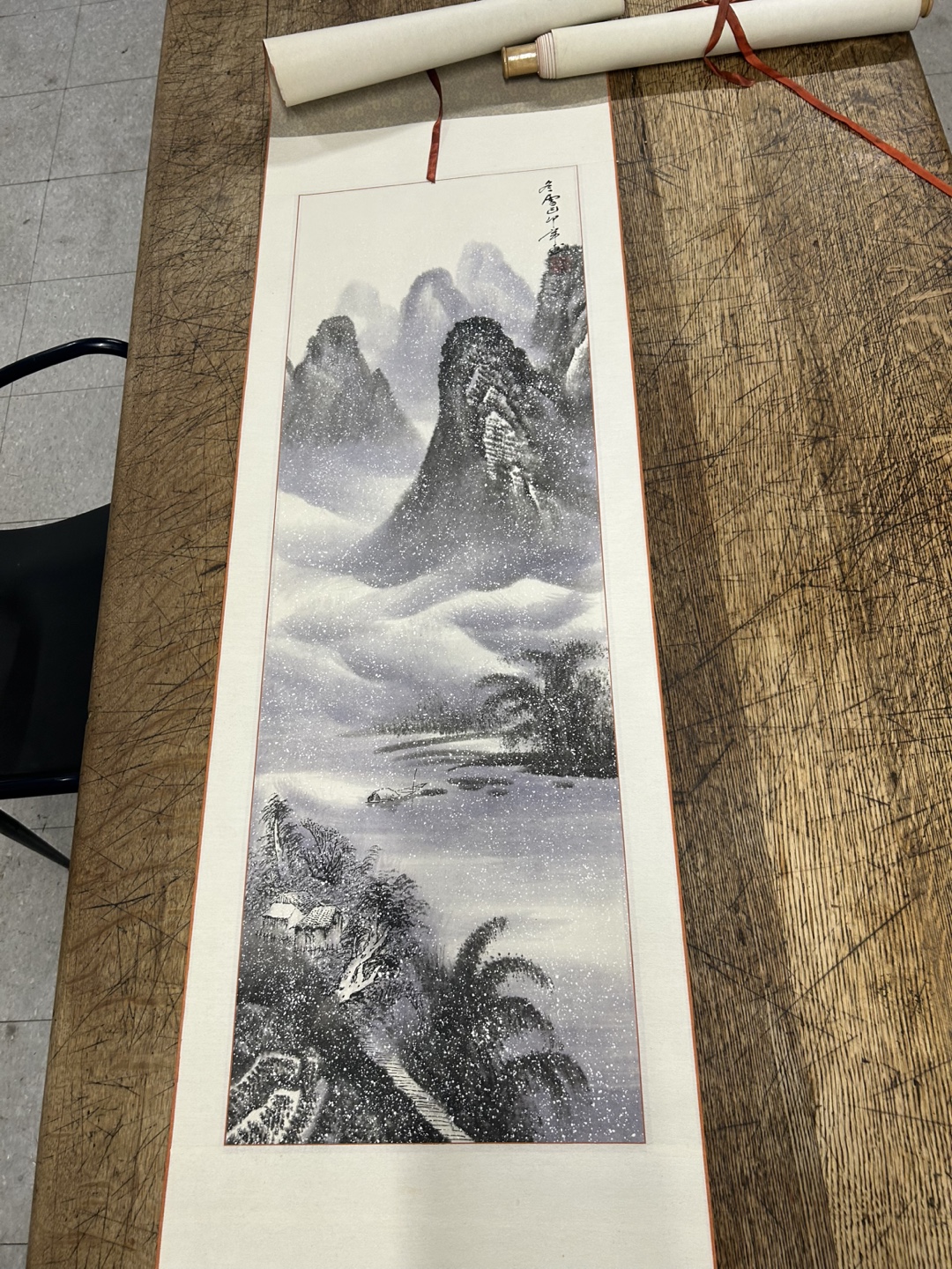 Selling a vintage Chinese landscape scroll painting. It features a serene mountain scene with traditional Chinese architecture. The painting is mounted on a scroll, ready to hang and add a touch of elegance to your home
