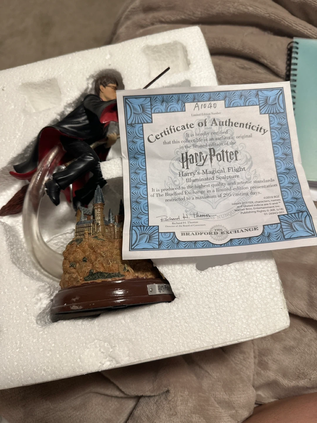 Selling a beautiful Harry Potter 'Harry's Magical Flight' Illuminated Sculpture from The Bradford Exchange. It's a limited edition sculpture, and comes with a certificate of authenticity. It depicts Harry flying over Hogwarts. This piece would be perfect for any Harry Potter fan!