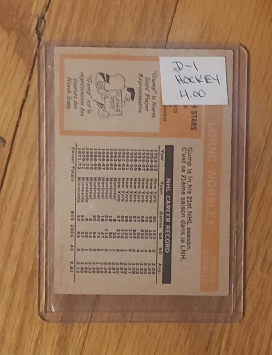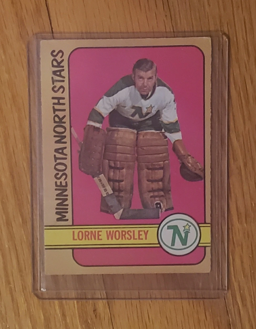 Lorne Worsley, goalie for the Minnesota North Stars. It's from the 1972 - 73 O-Pee-Chee set, card # 28 In a protective case $4