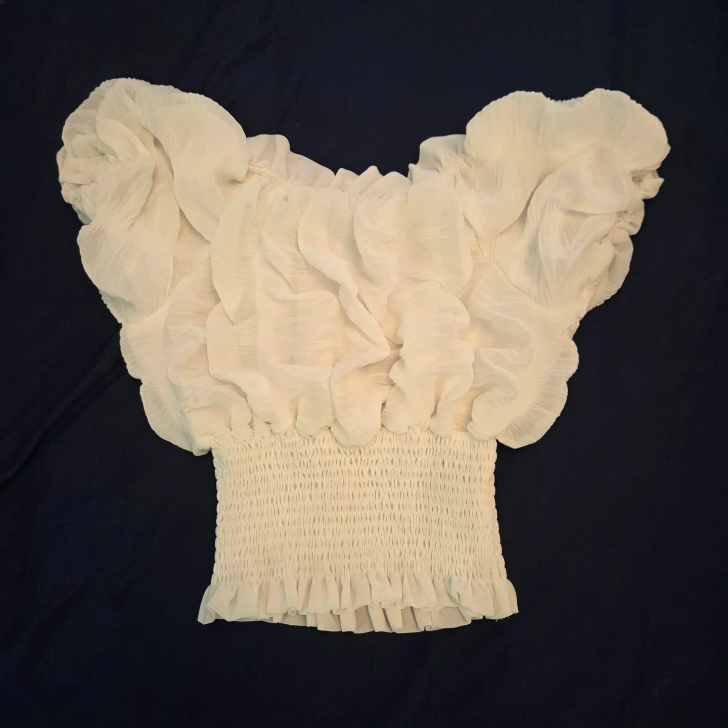 This is a cute off-the-shoulder top with a smocked bust and ruffled sleeves. It's made of a lightweight, sheer fabric that drapes beautifully. The white colour makes it versatile for any occasion.