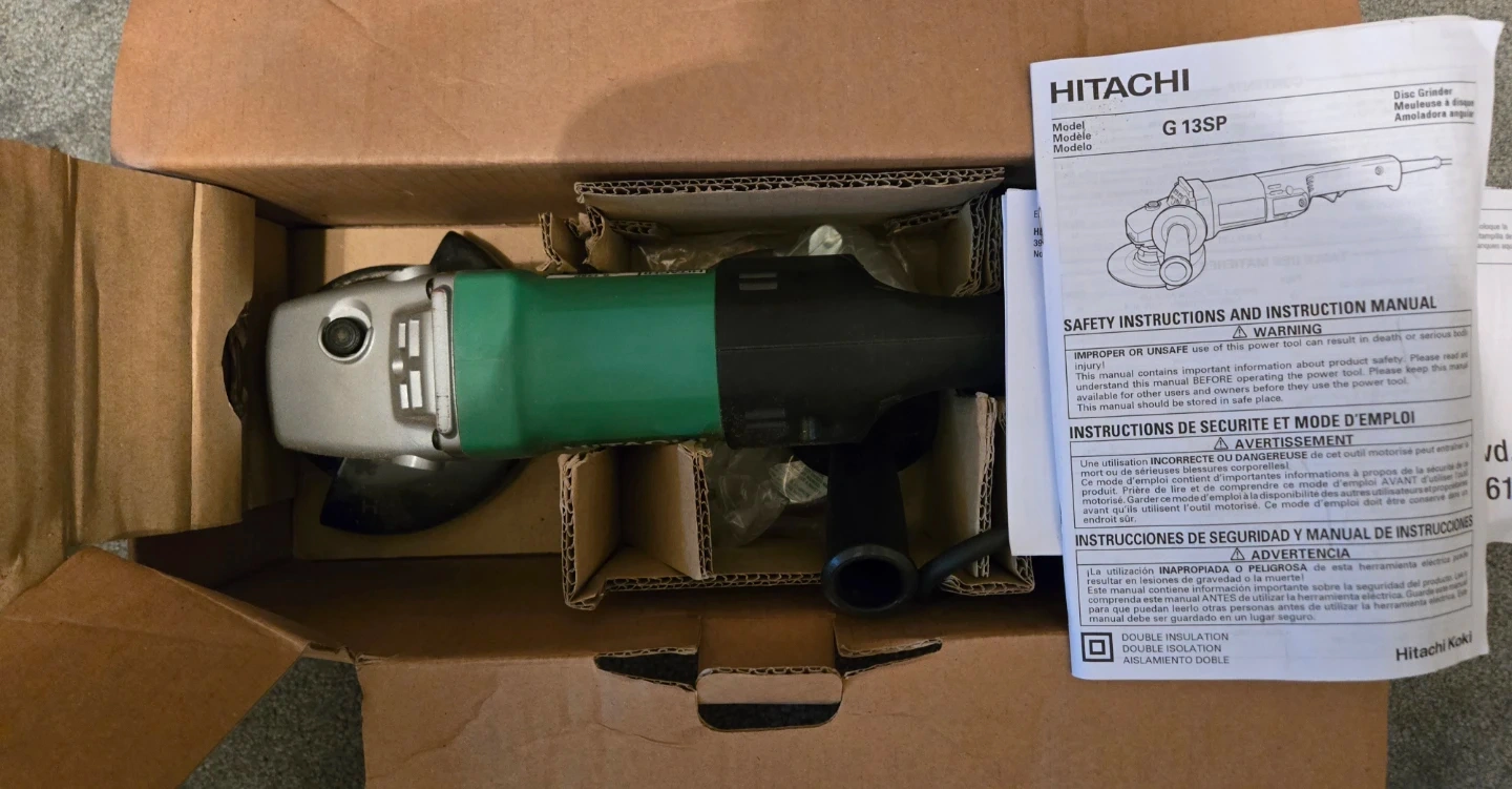 This is a Hitachi G13SP disc grinder. It features double insulation for safety. Includes the original instruction manual.