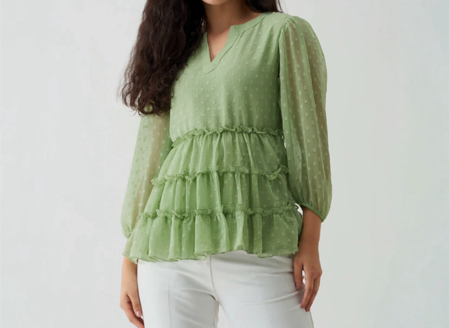 This pretty green blouse features a v-neck and long puff sleeves. It's made from a sheer fabric with a subtle polka dot pattern and has tiered ruffled detailing. It's a great top for dressing up or down!