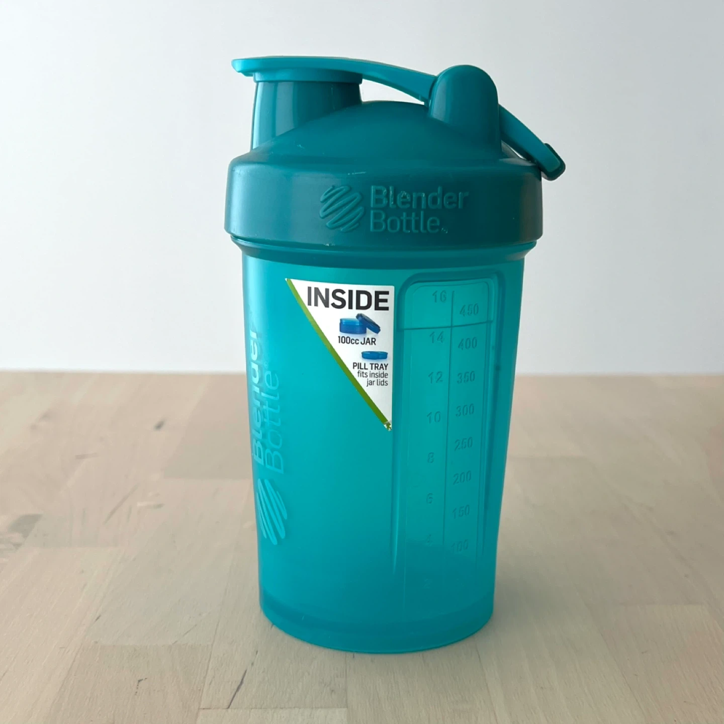 Teal Blender Bottle shaker with a 100cc jar for supplements. It includes a pill tray that fits inside the jar lid.