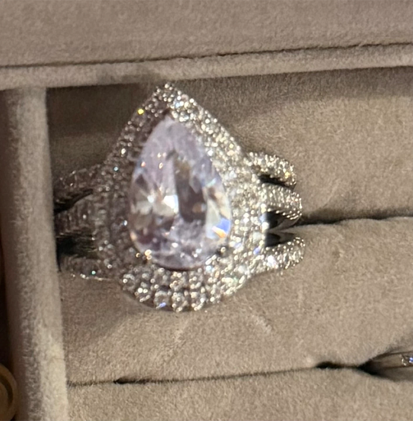 A beautiful pear-cut cubic zirconia ring set. It features a large center stone surrounded by smaller sparkling stones. This ring set would be perfect for a special occasion or as an engagement ring!