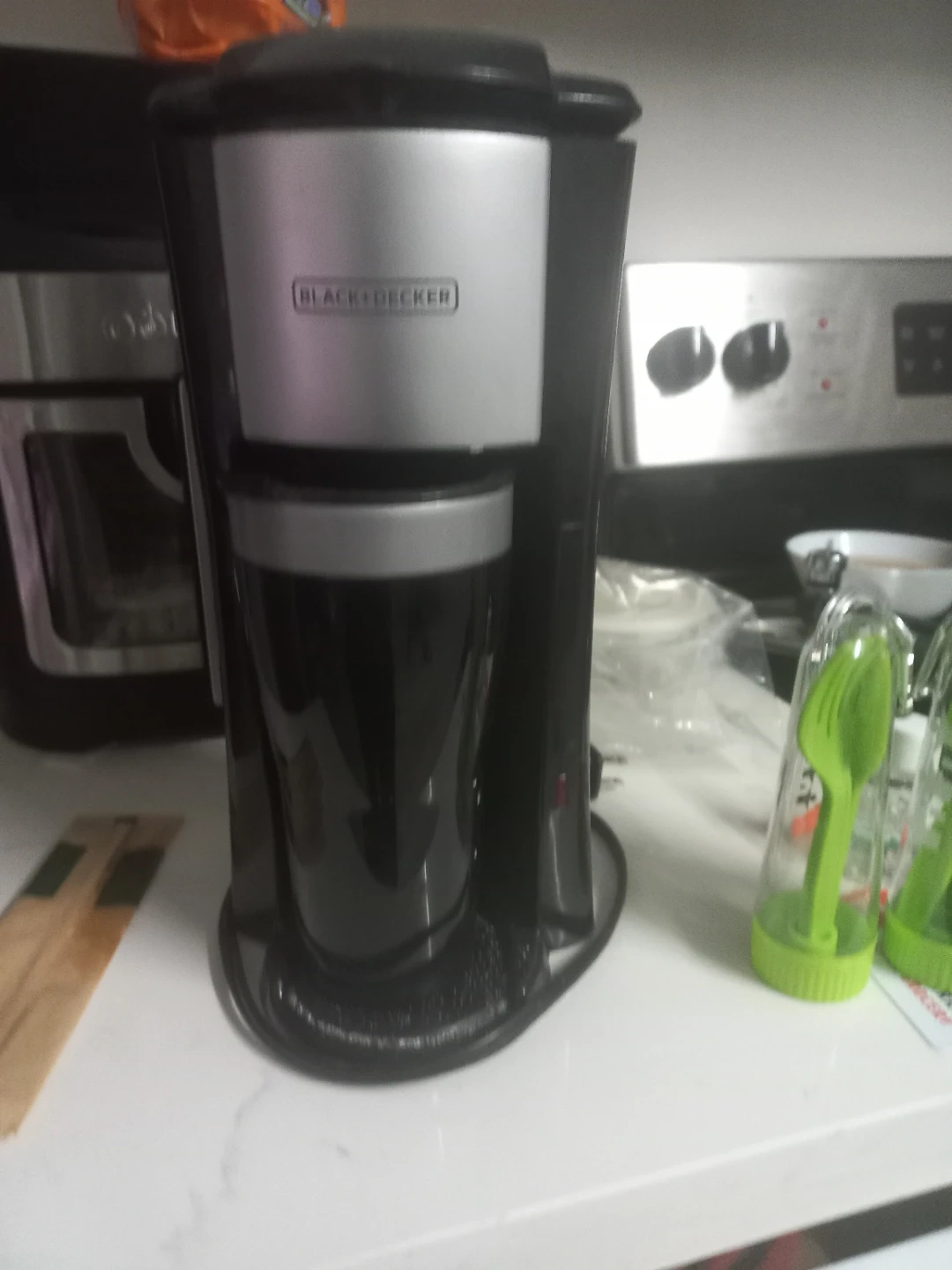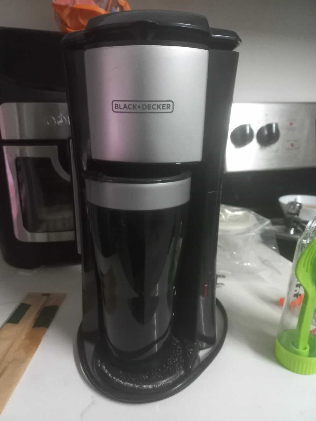 This BLACK+DECKER coffee maker brews a single serving directly into a travel mug. It's compact and convenient for quick coffee on the go. Perfect for busy mornings!