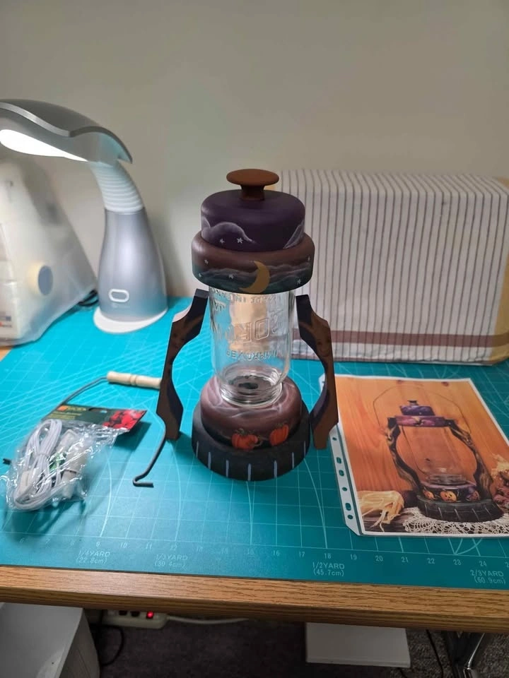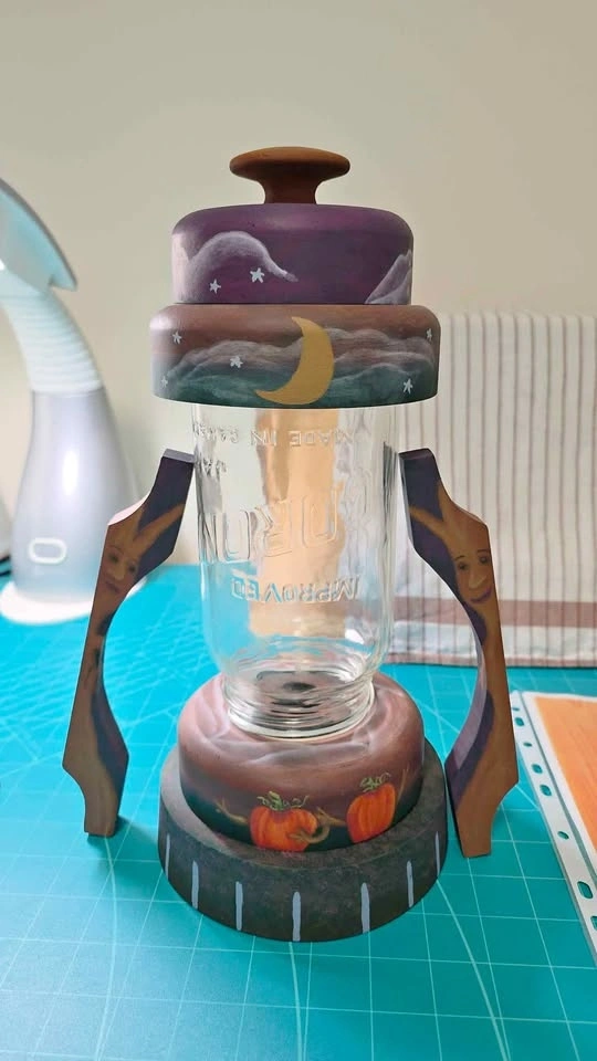 Folk Artist's Halloween Mason Jar Lantern Project to Finish. Needs some finishing paint details. Varnish and then put together. All pieces are there. Electric light comes with it. Pattern included. Smoke free home. Pick up in west end of Peterborough.