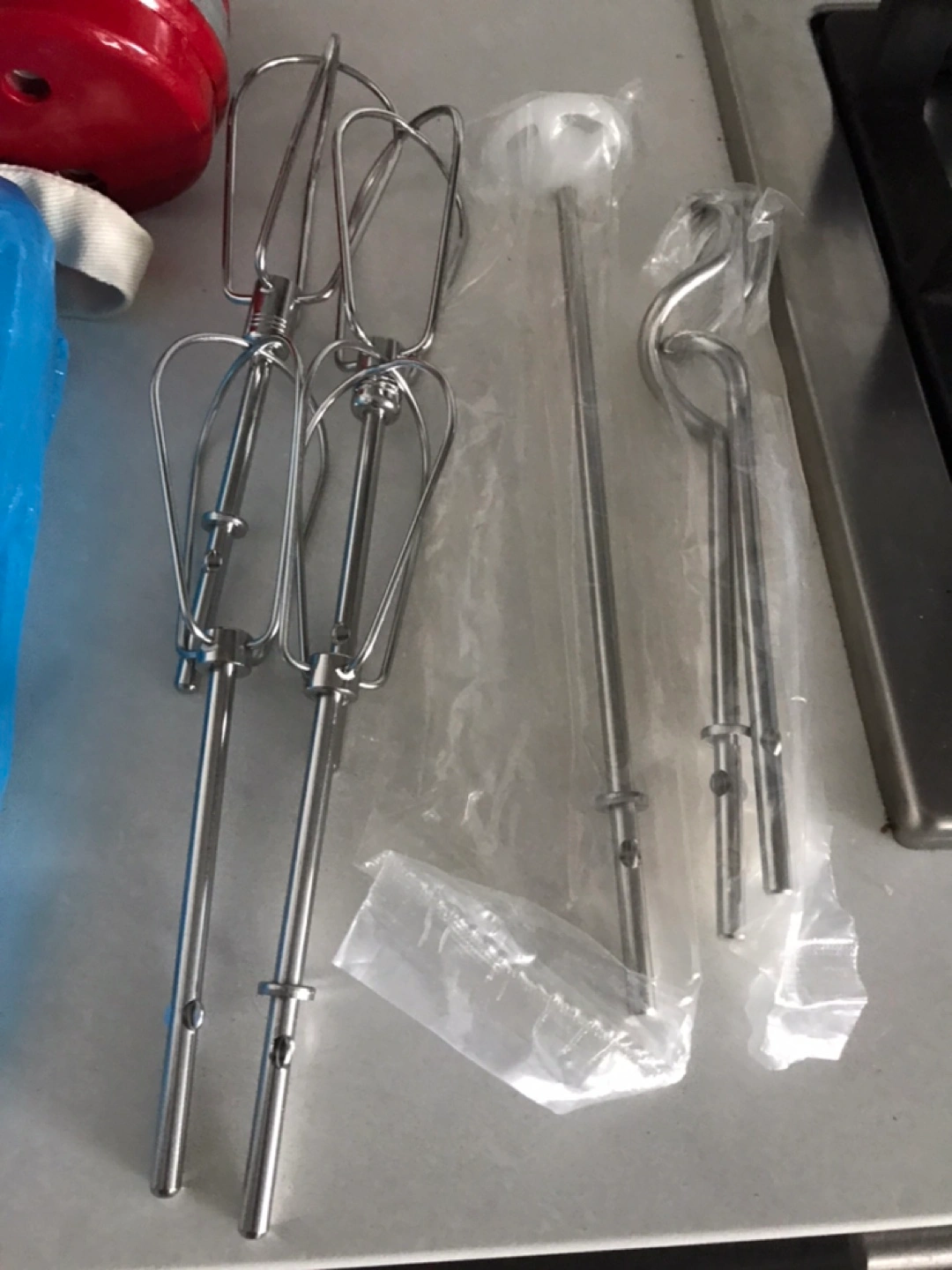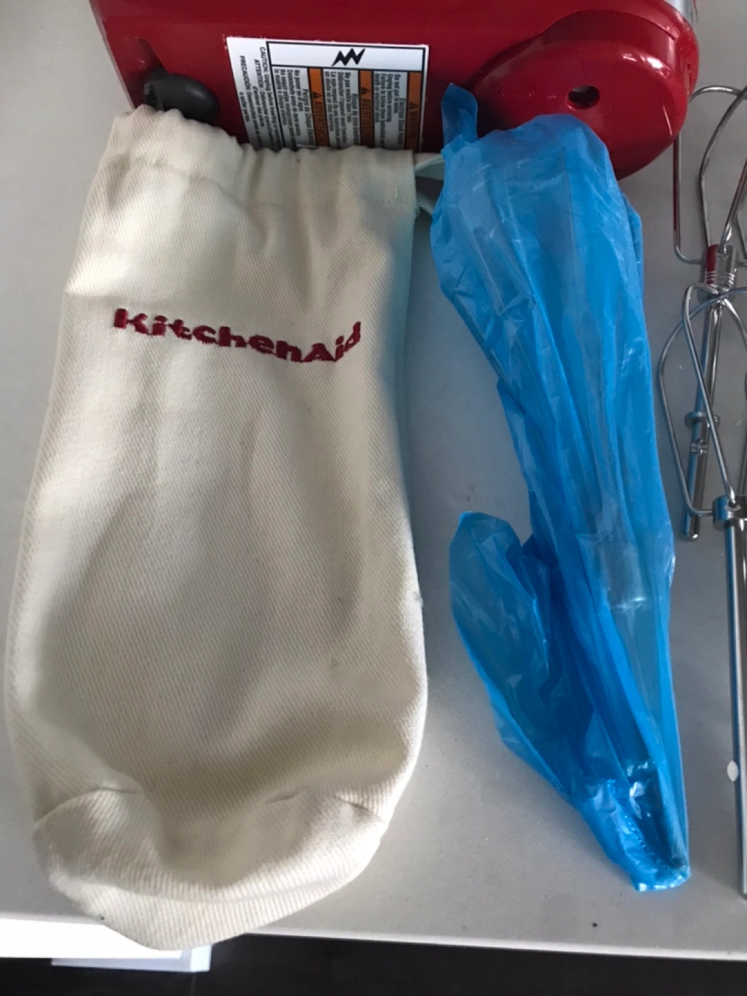 KitchenAid hand mixer (burgundy colour). Five speeds, with all 5 attachments (only 1 pair of the mixer heads have ever been used). Storage bag also included.