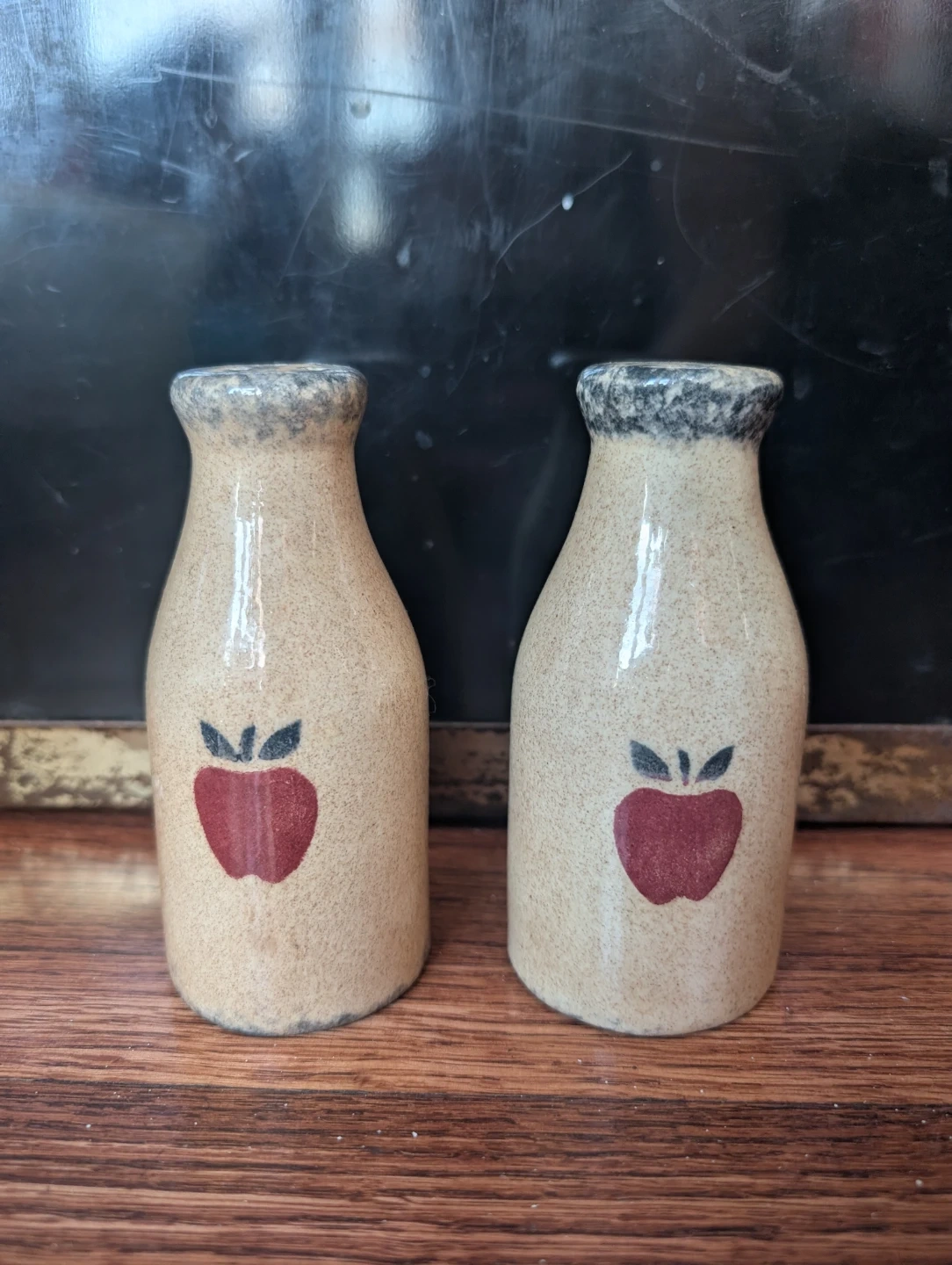 Two ceramic shakers shaped like small milk bottles with a red apple design. They have a speckled beige finish with a dark rim. These would be charming for any kitchen counter!