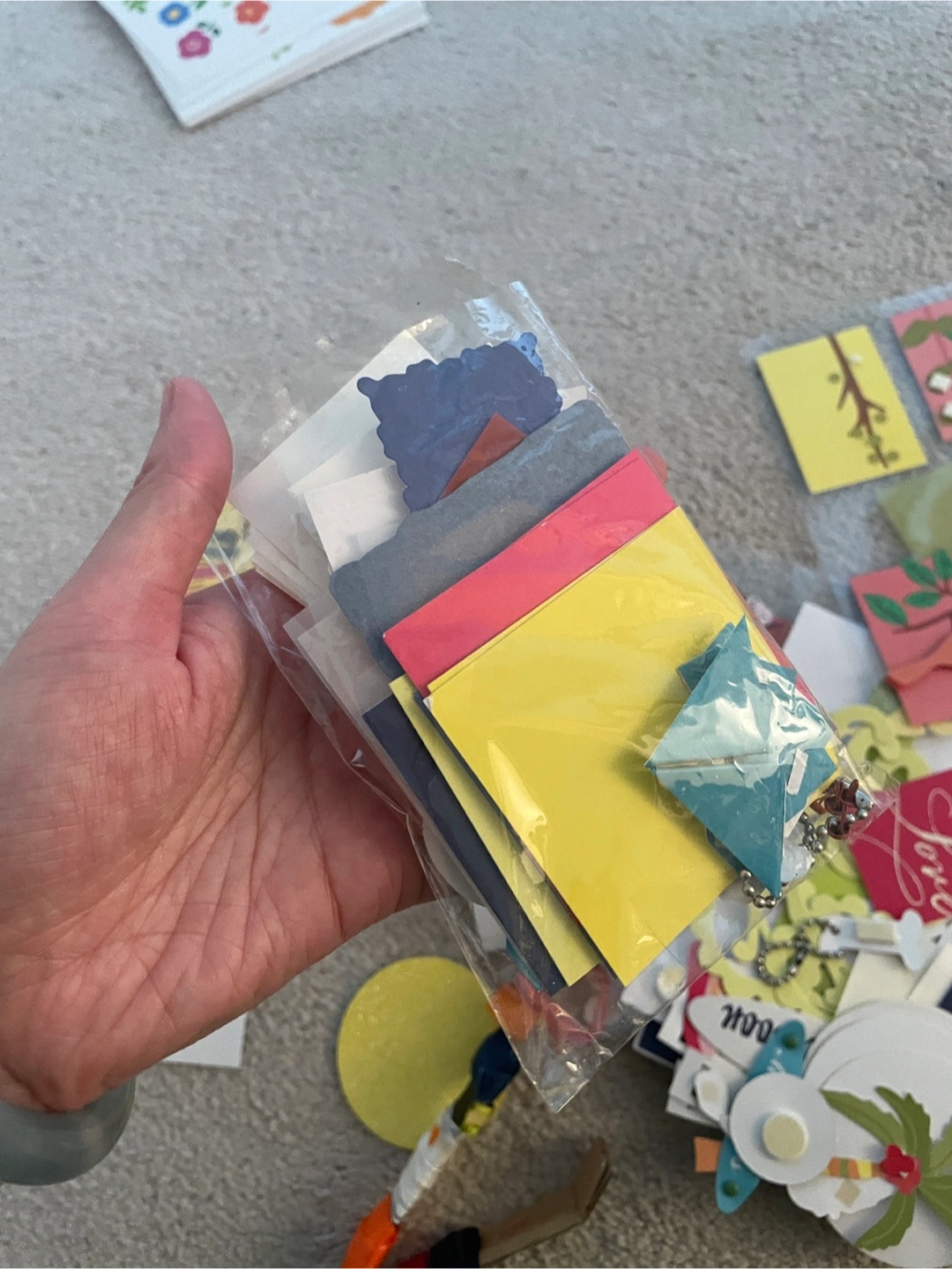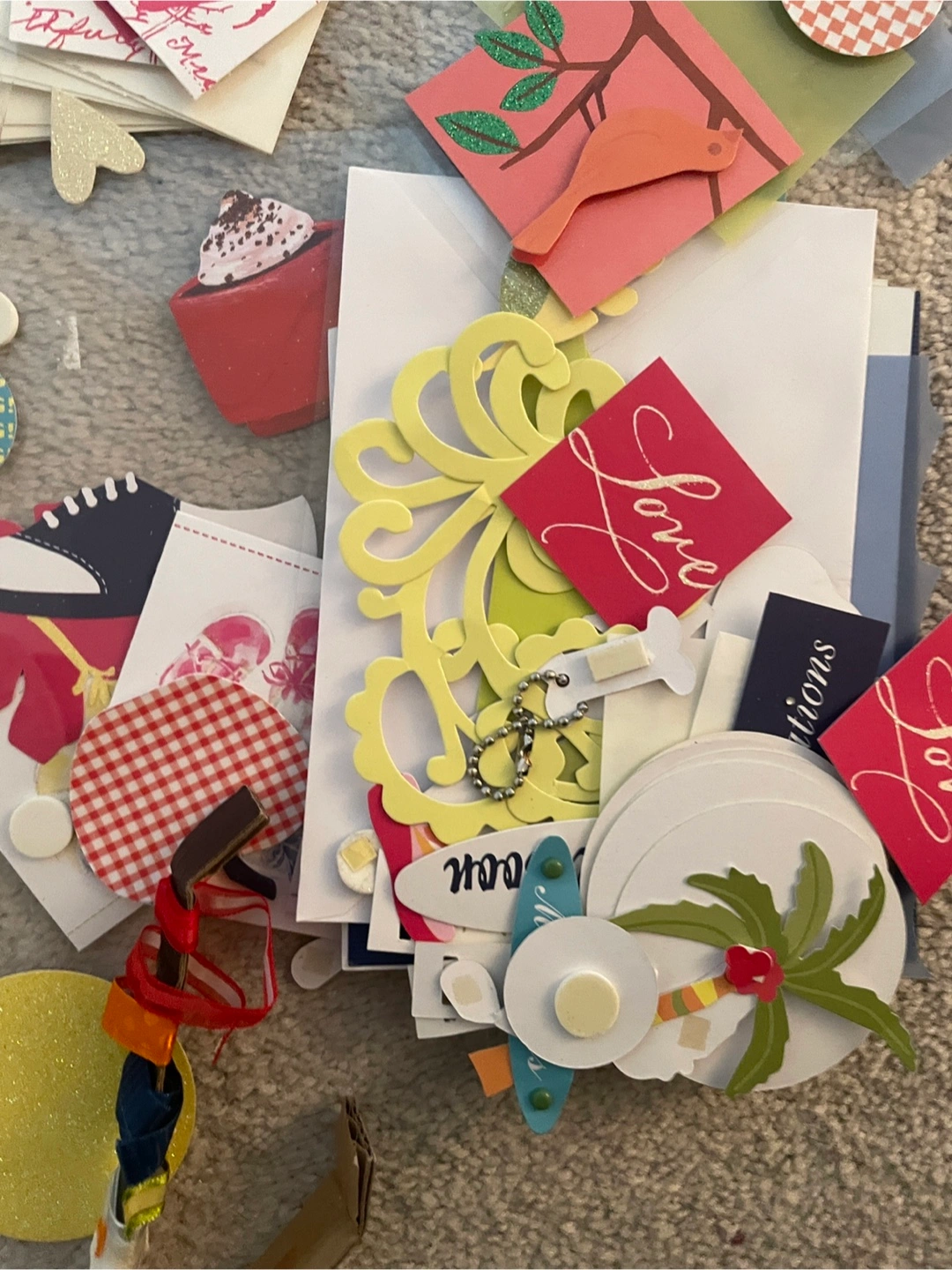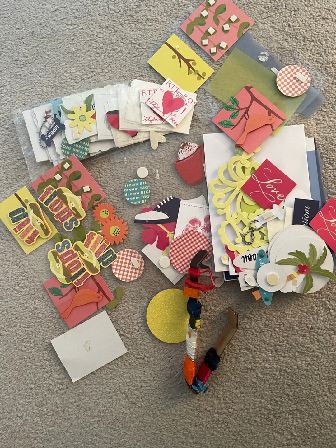 A collection of assorted craft embellishments and stickers. Includes paper die-cuts, foam stickers, and decorative elements like flowers, words, and themed designs. These are great for scrapbooking and card making projects.