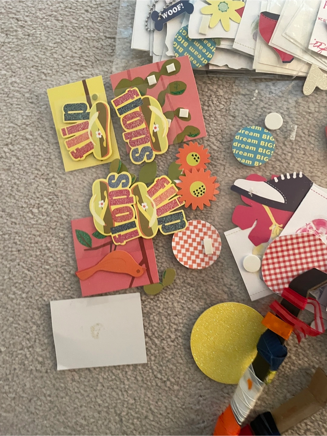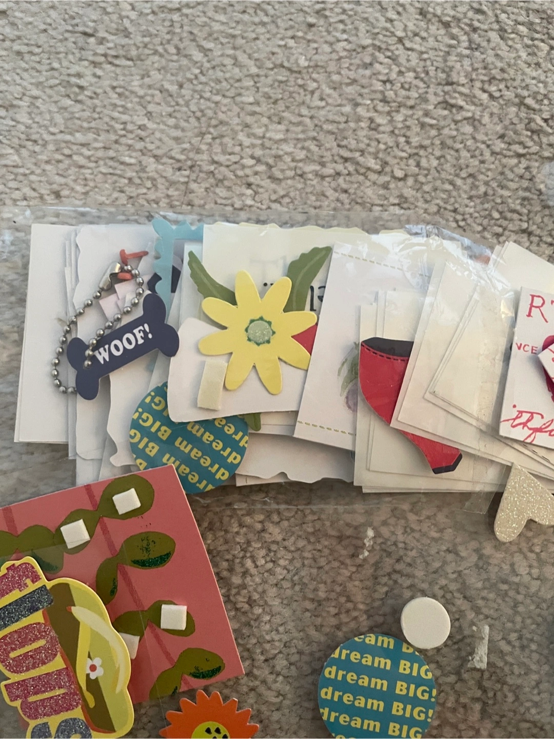 A collection of assorted craft embellishments and stickers. Includes paper die-cuts, foam stickers, and decorative elements like flowers, words, and themed designs. These are great for scrapbooking and card making projects.