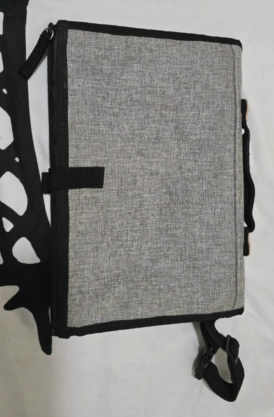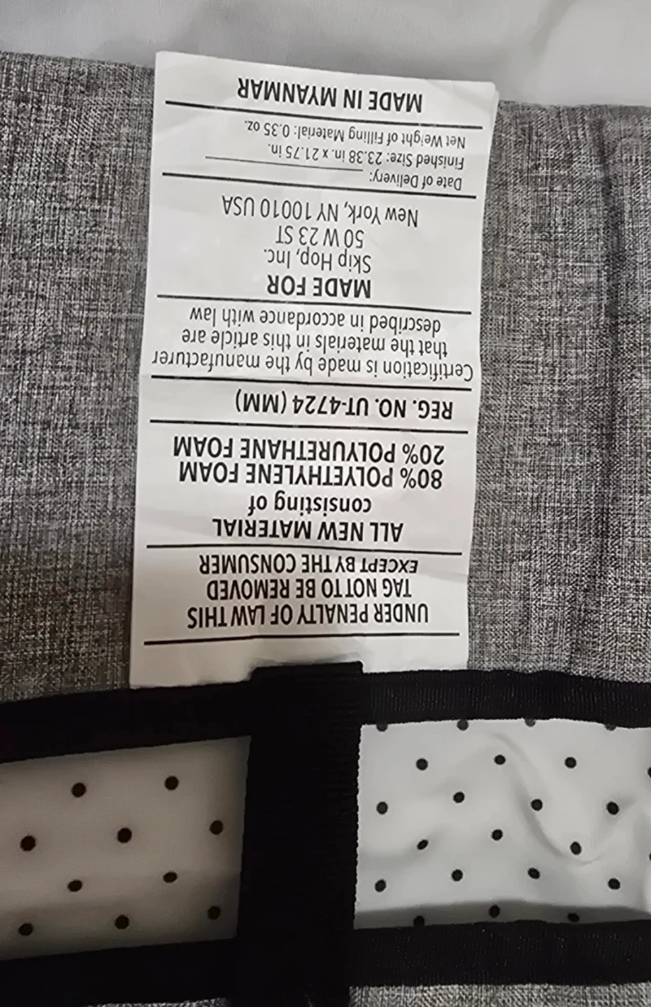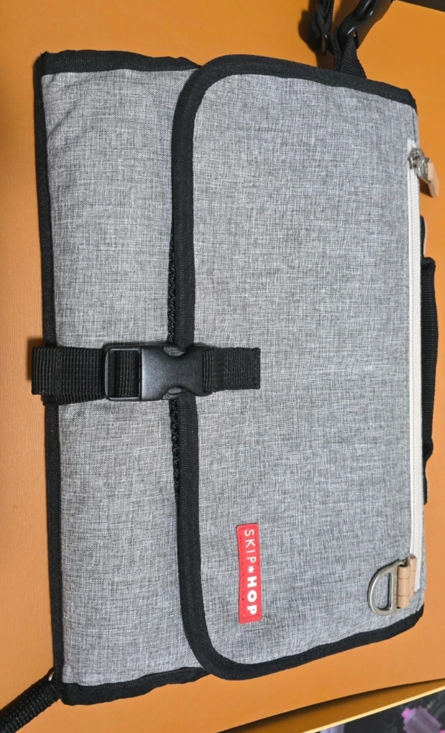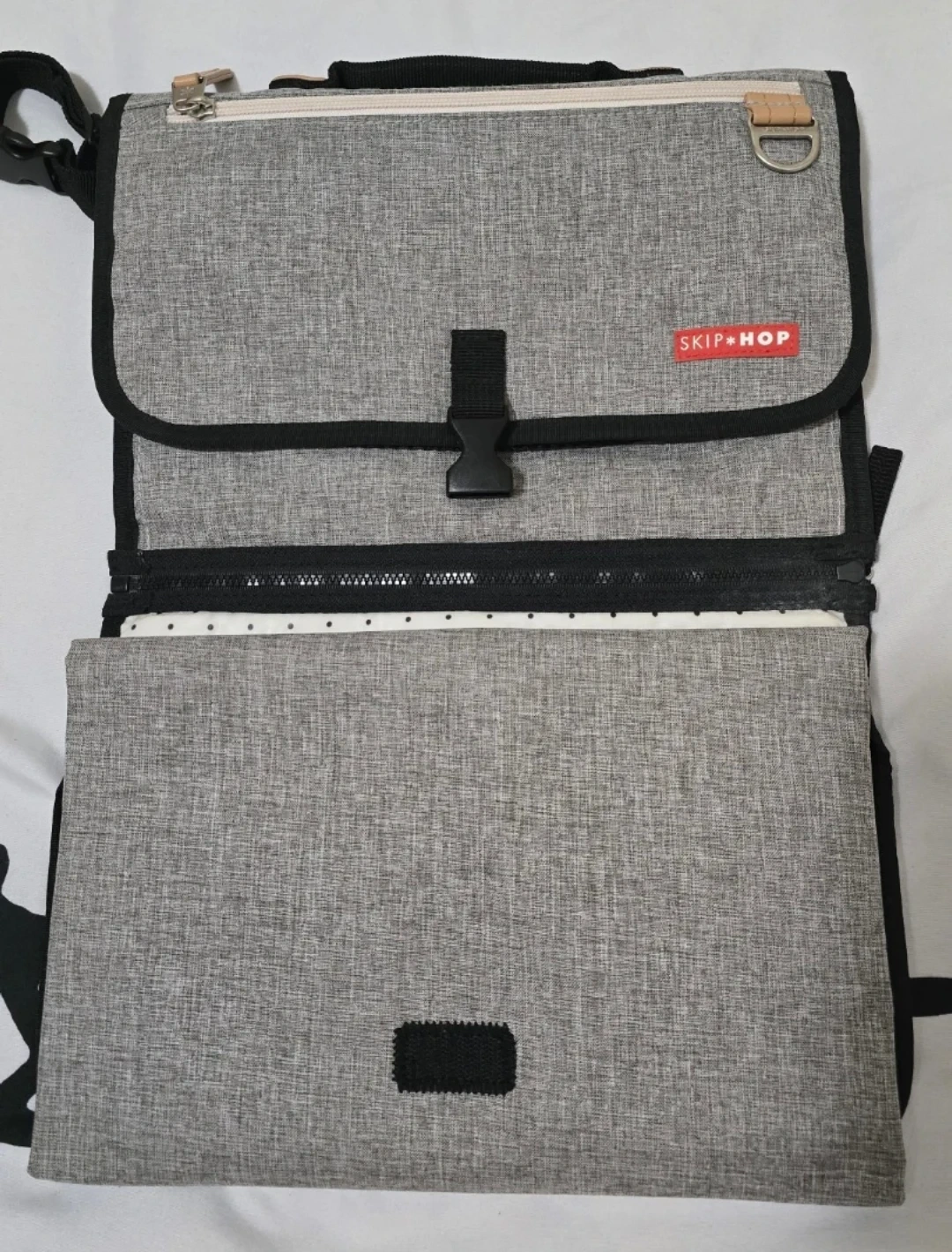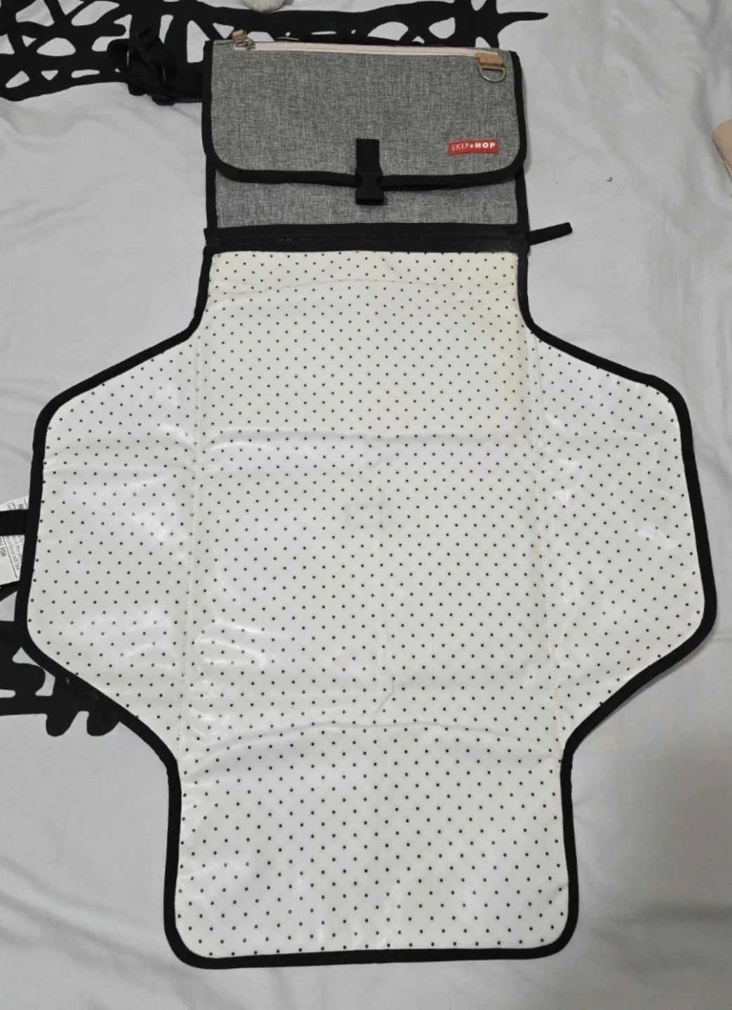 This is a Skip Hop changing pad kit. It's made with 80% polyethylene foam and 20% polyurethane foam. The finished size is 23.38 in. x 21.75 in. It's great for on-the-go diaper changes!