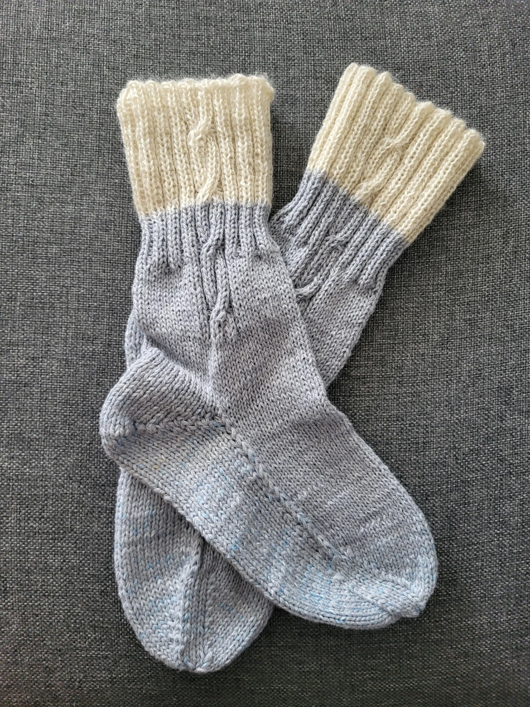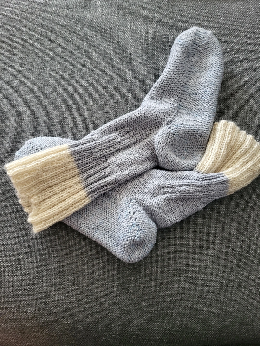 Hand-knitted angora /wool socks slippers or over pants in a blue-grey/cream colour. These socks feature a wide ribbed cuff and detailed stitching along the leg. Made of wool and strangled cotton fibres for sole. Just finished.