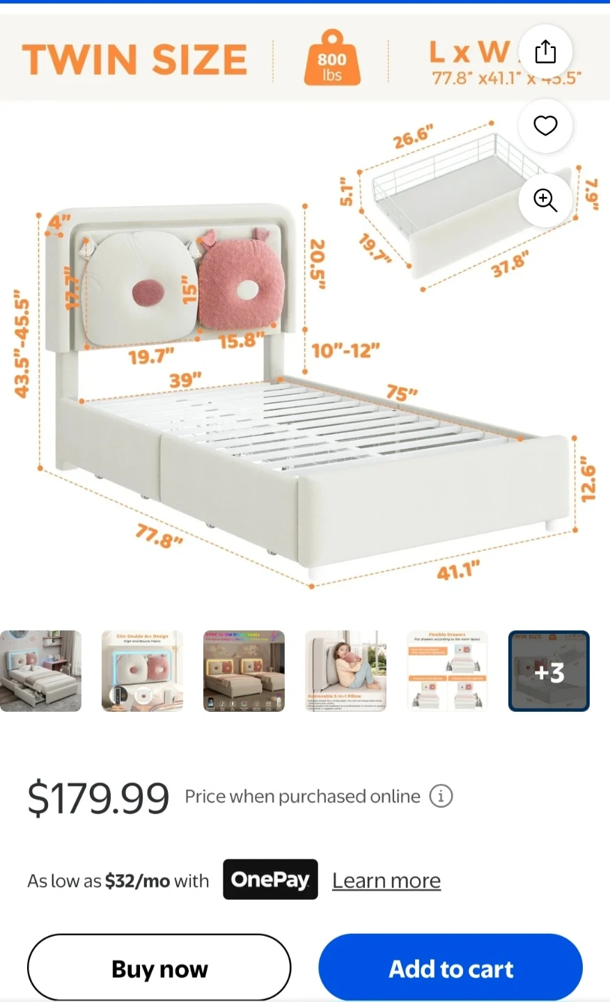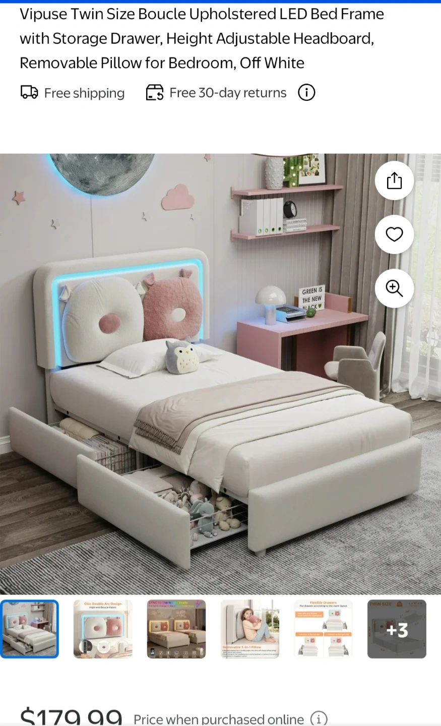 This Vipuse twin size bed frame features a modern upholstered design with LED lighting. It includes a storage drawer and a removable pillow for added comfort. The adjustable headboard offers personalized support.
