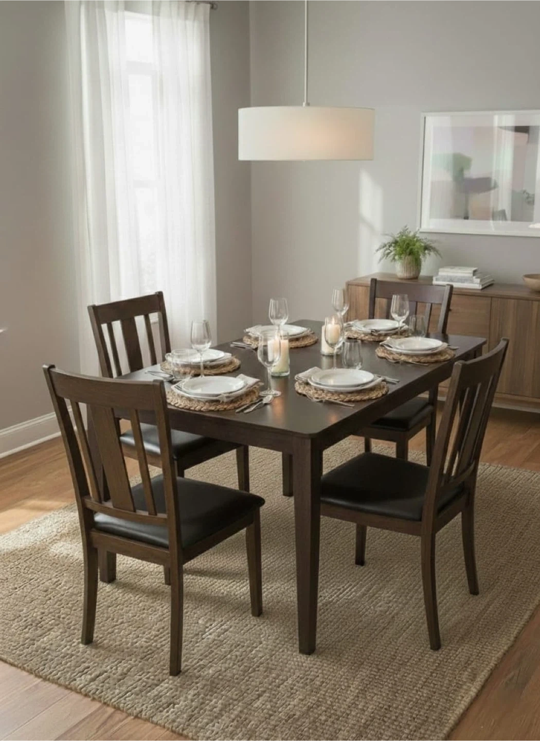 Dark brown dining table and four chairs. Chairs have black upholstered seats. Table is dark wood with a rectangular top. Free delivery in GTA. Cash upon delivery 🚚