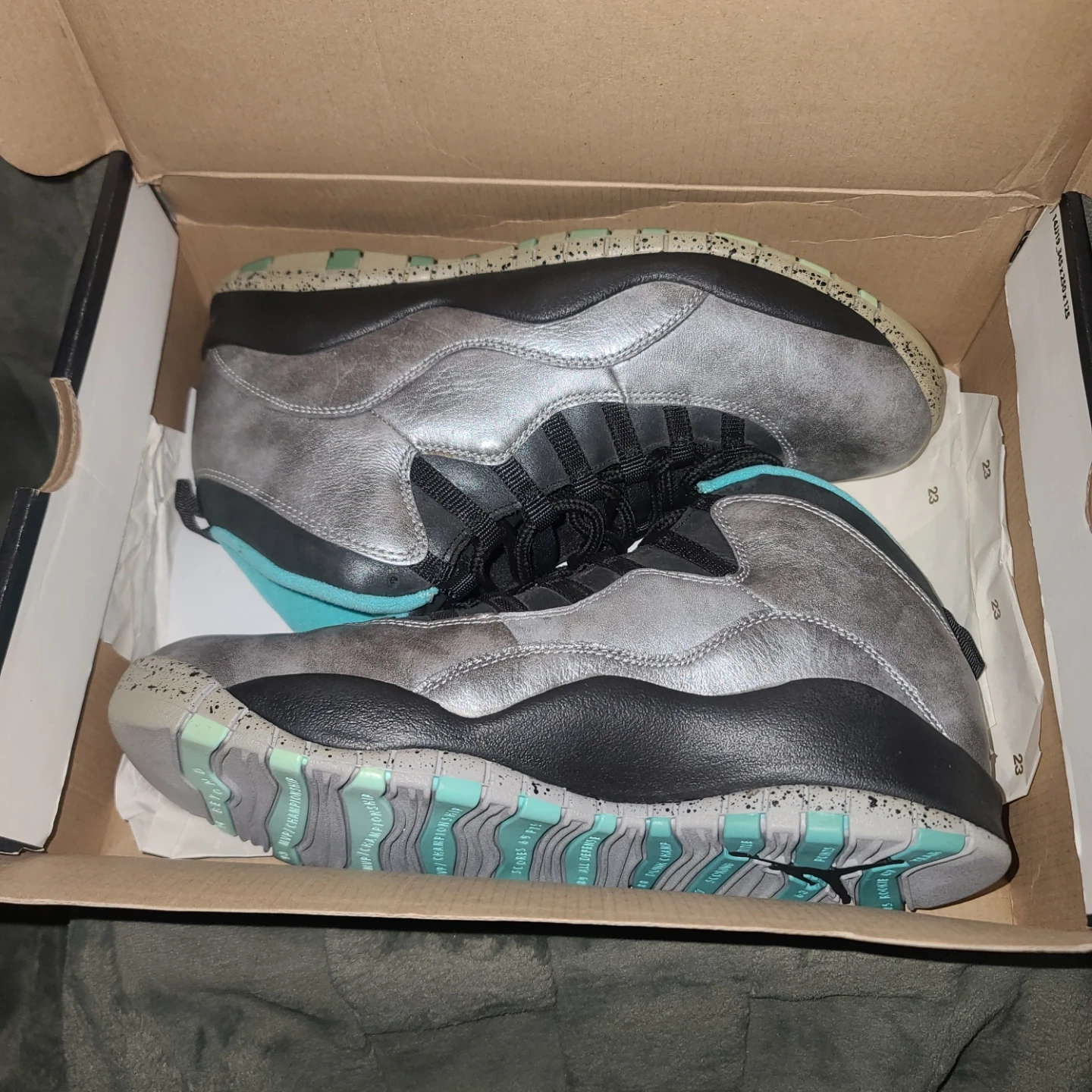 These Air Jordan 10 Retro sneakers come in a metallic silver and black colorway with teal accents. They include the original box. These are a great addition to any sneaker collection!