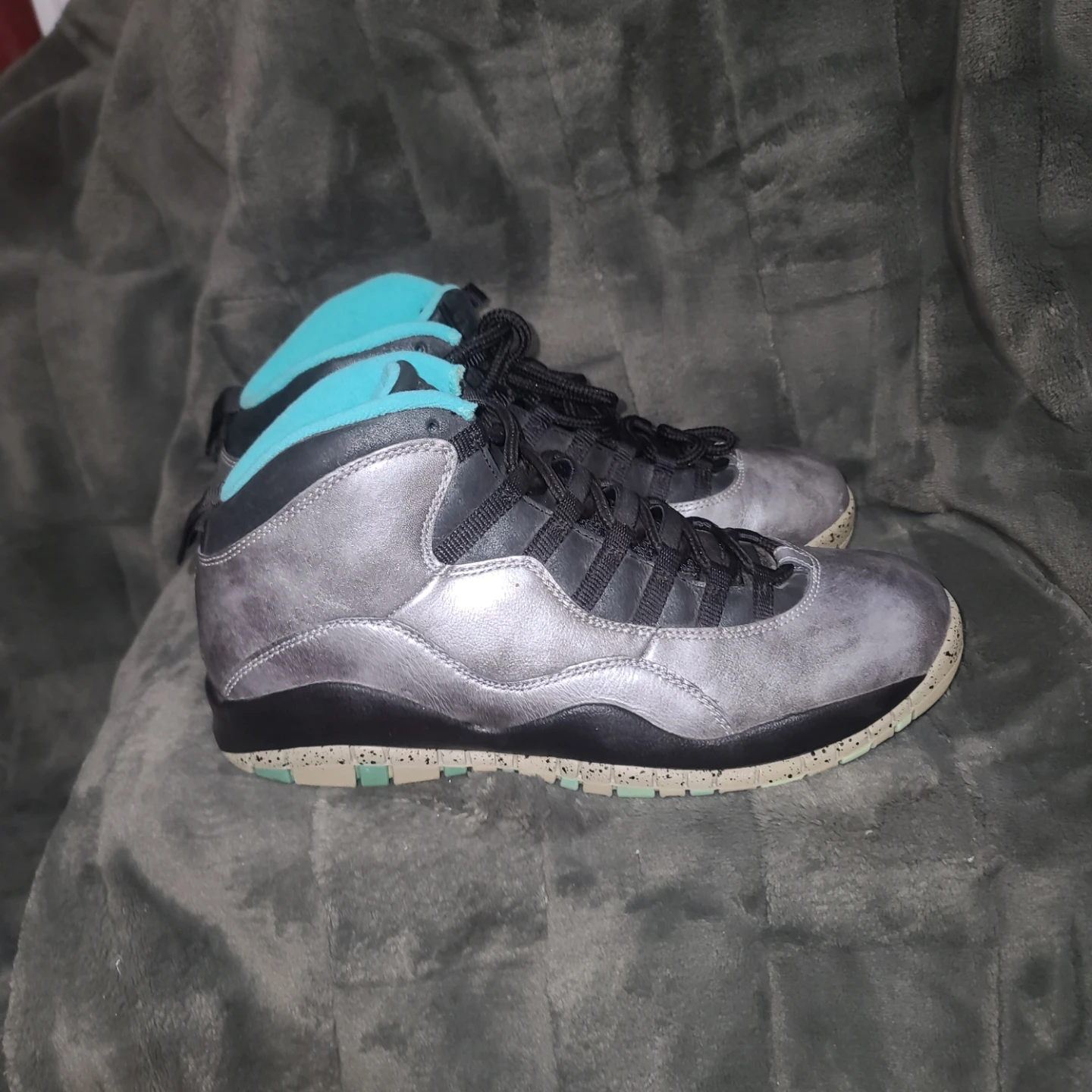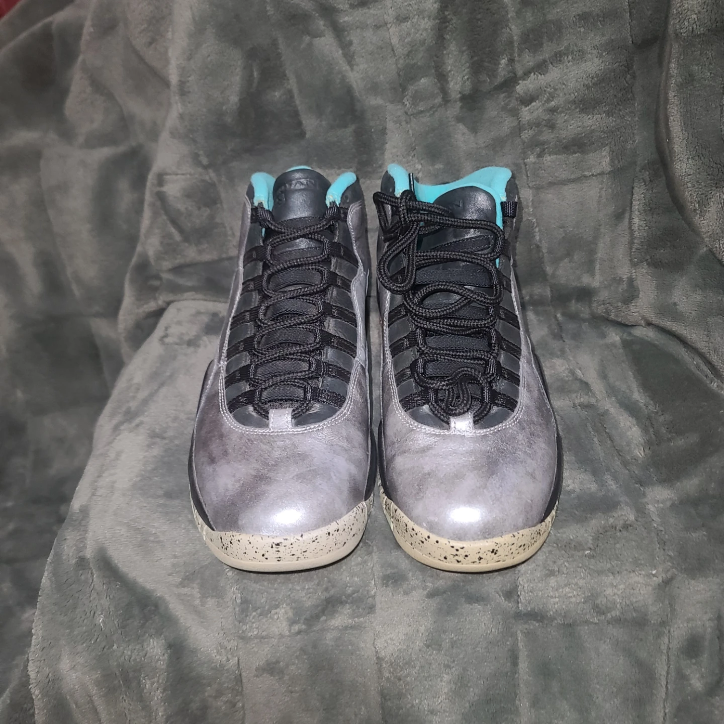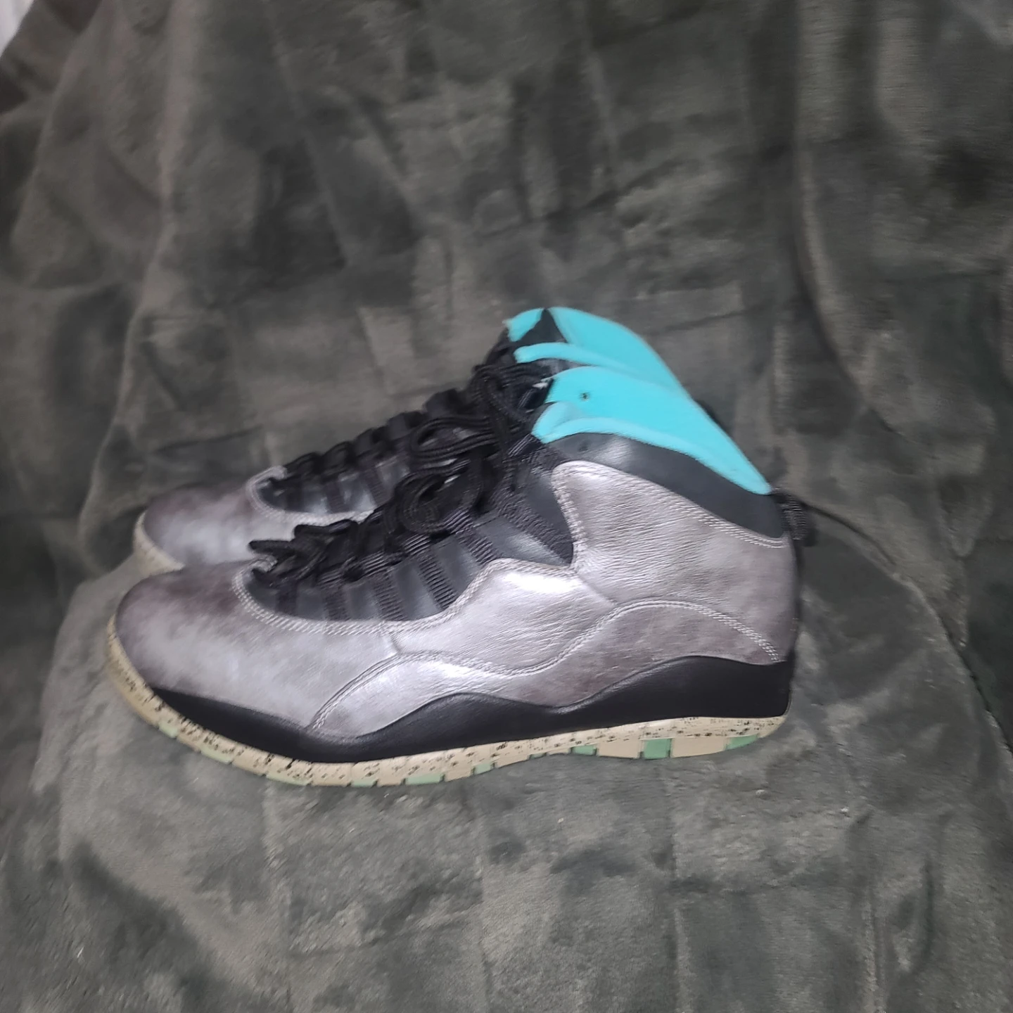 These Air Jordan 10 Retro sneakers come in a metallic silver and black colorway with teal accents. They include the original box. These are a great addition to any sneaker collection!