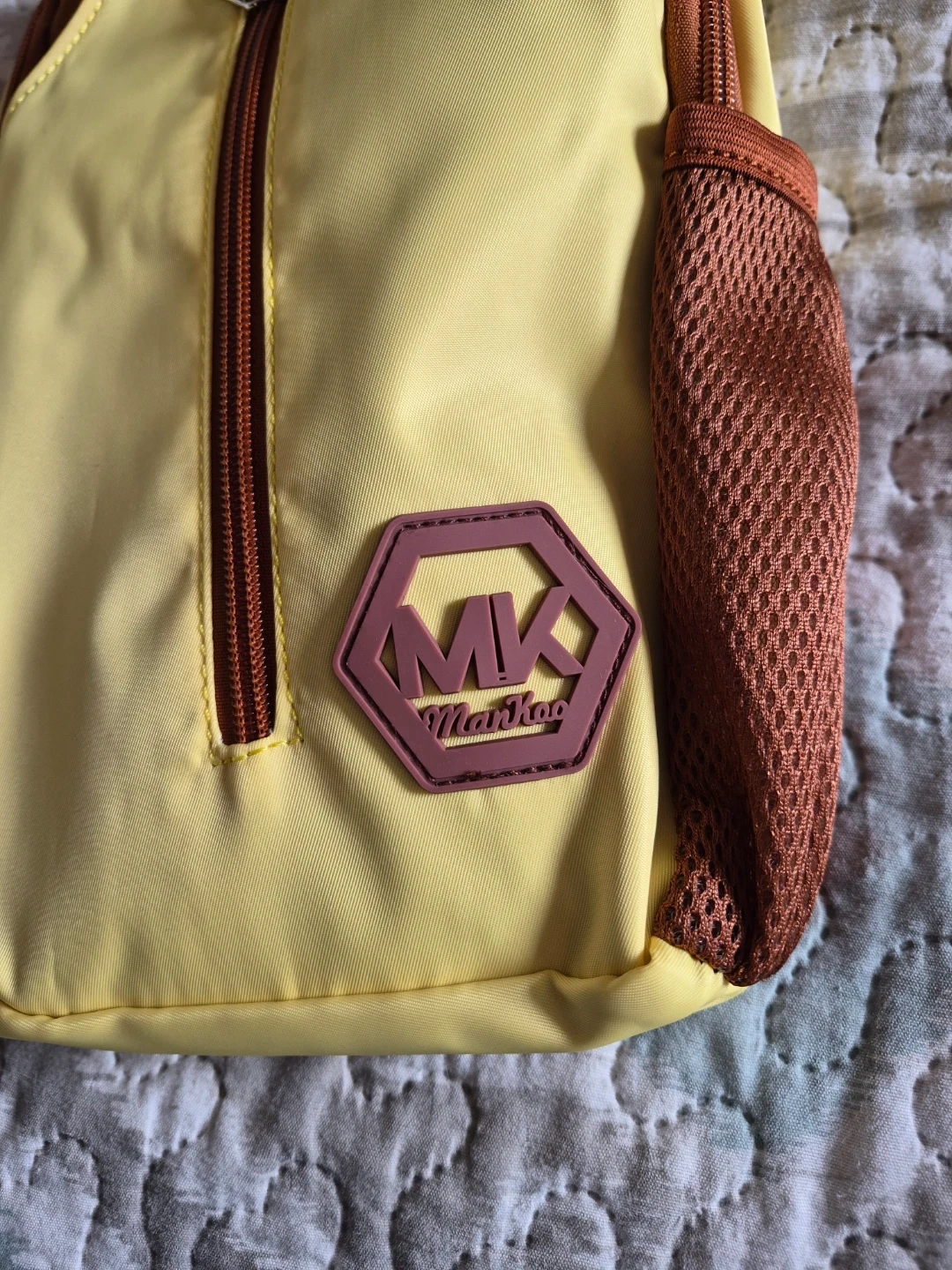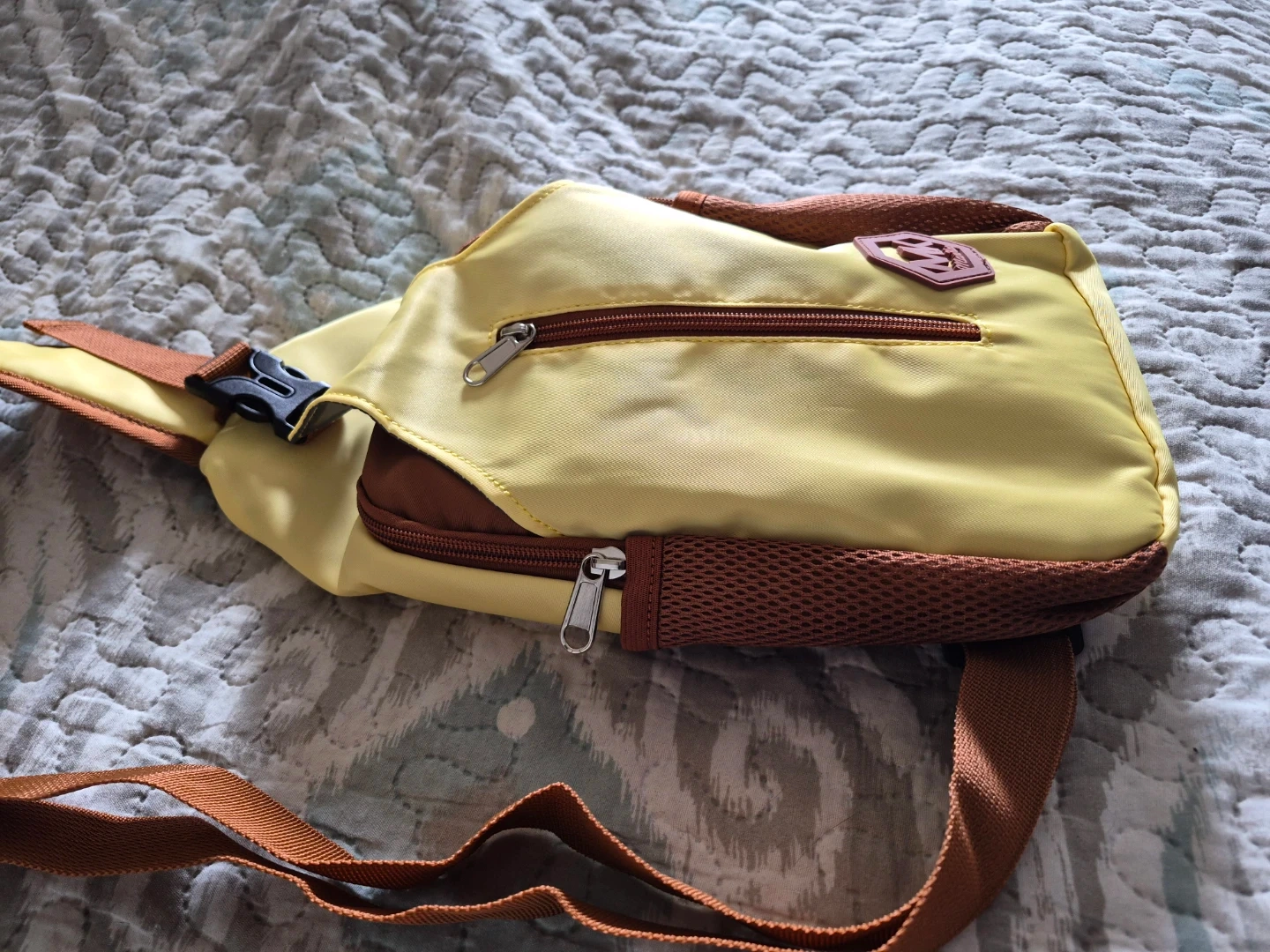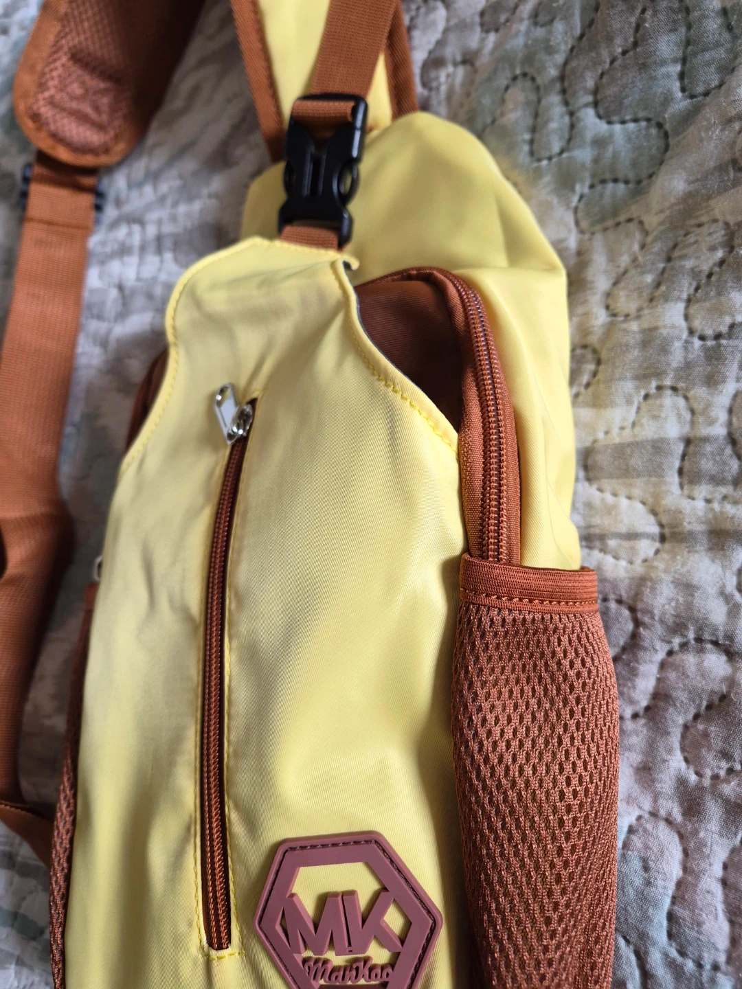 Mankar Yellow & Brown Sling Backpack Purse, Durable Nylon, Multiple Pockets, Buckle Closure Adjustable Straps Brand Bew without Tags
